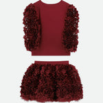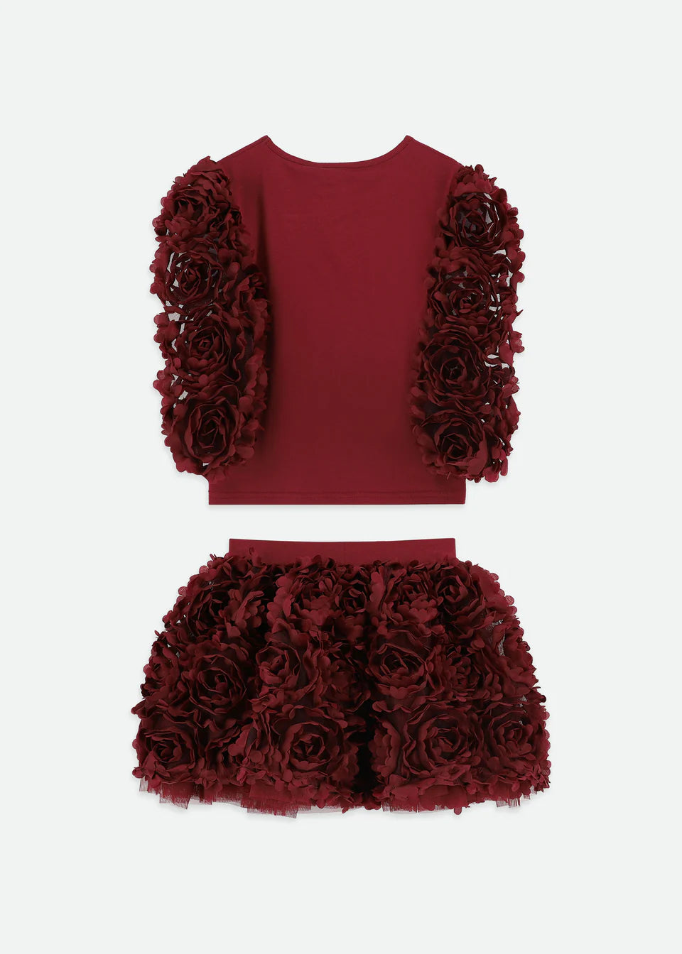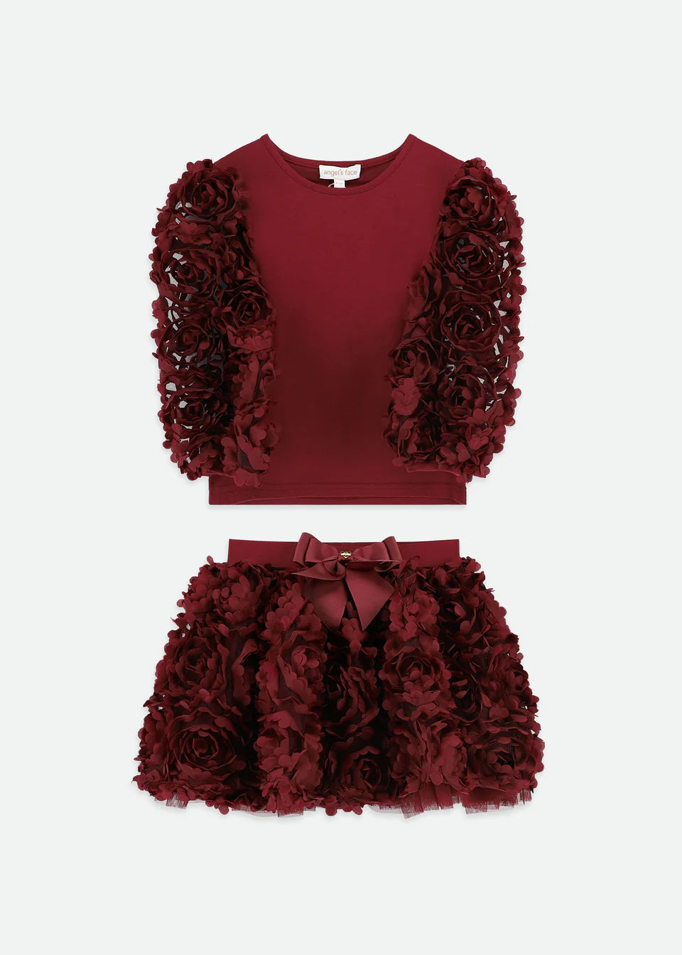 Sfoggia il tuo stile con questo elegante completo top e gonna bordeaux per bambine. Il top in morbido jersey presenta maniche scenografiche ricoperte da splendide applicazioni floreali 3D per un look di grande impatto. La gonna coordinata presenta strati di splendidi fiori 3D e una comoda cintura elasticizzata, rifinita con un elegante fiocco in gros-grain e la nostra esclusiva borchia con logo a cuore dorato. Perfetto per feste, occasioni speciali o ogni volta che vuole sentirsi speciale.