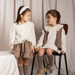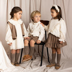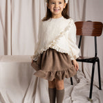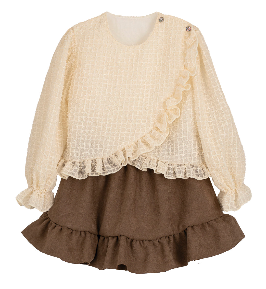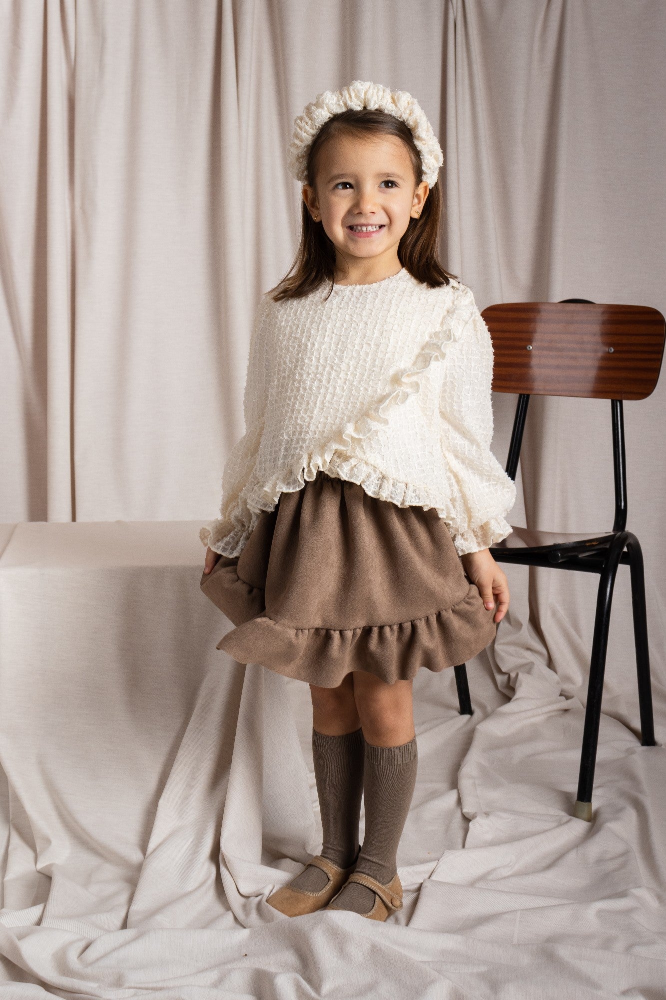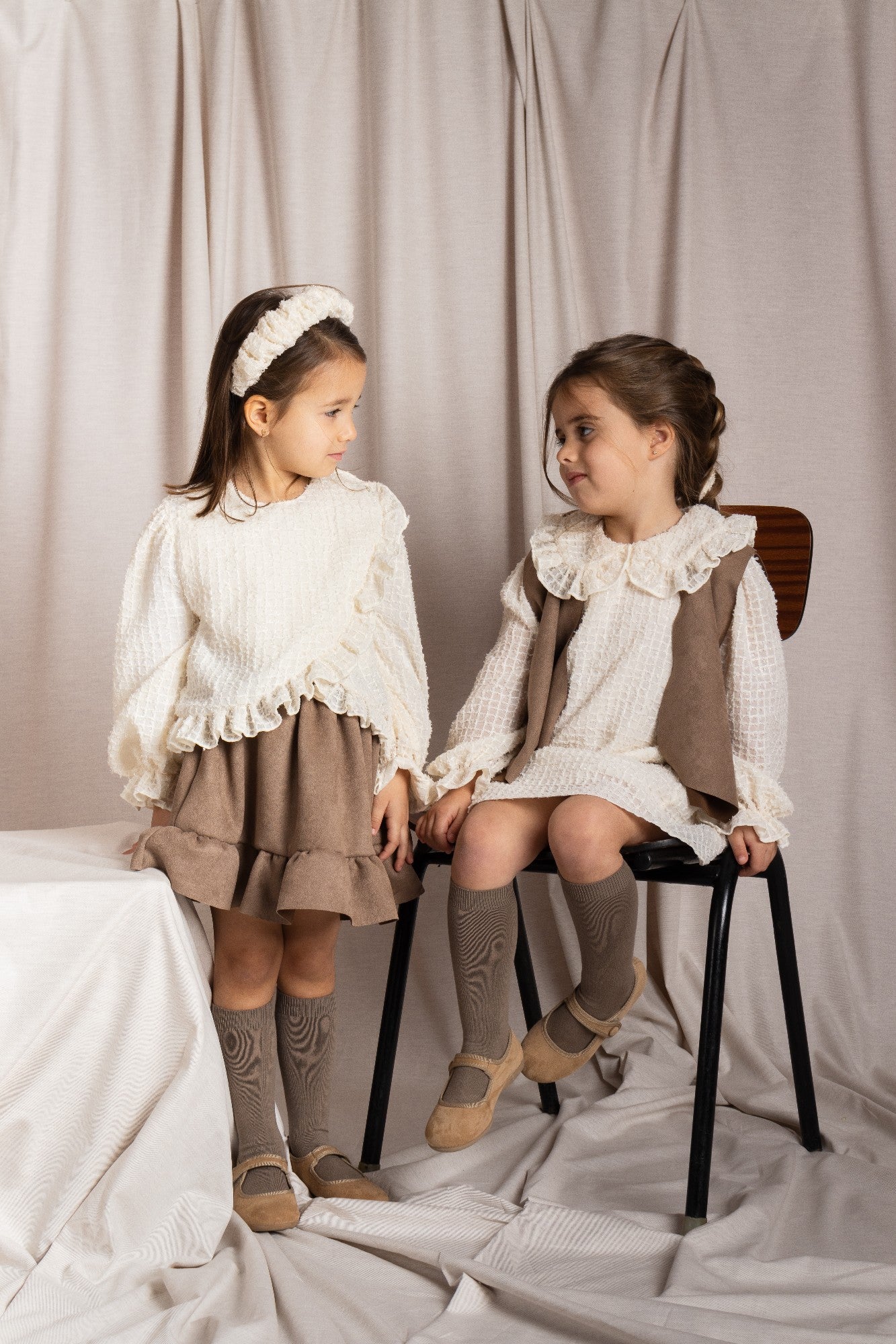 Questo completo sofisticato per bambina unisce una gonna scamosciata raffinata a una camicia elegante, creando un look chic e alla moda. La texture morbida della gonna garantisce comfort e stile, mentre la camicia dona un tocco di classe adatto a ogni occasione speciale. Perfetto per eventi formali o momenti in cui è richiesto un outfit curato, questo completo combina design e funzionalità con grazia ed eleganza.