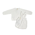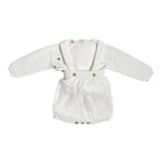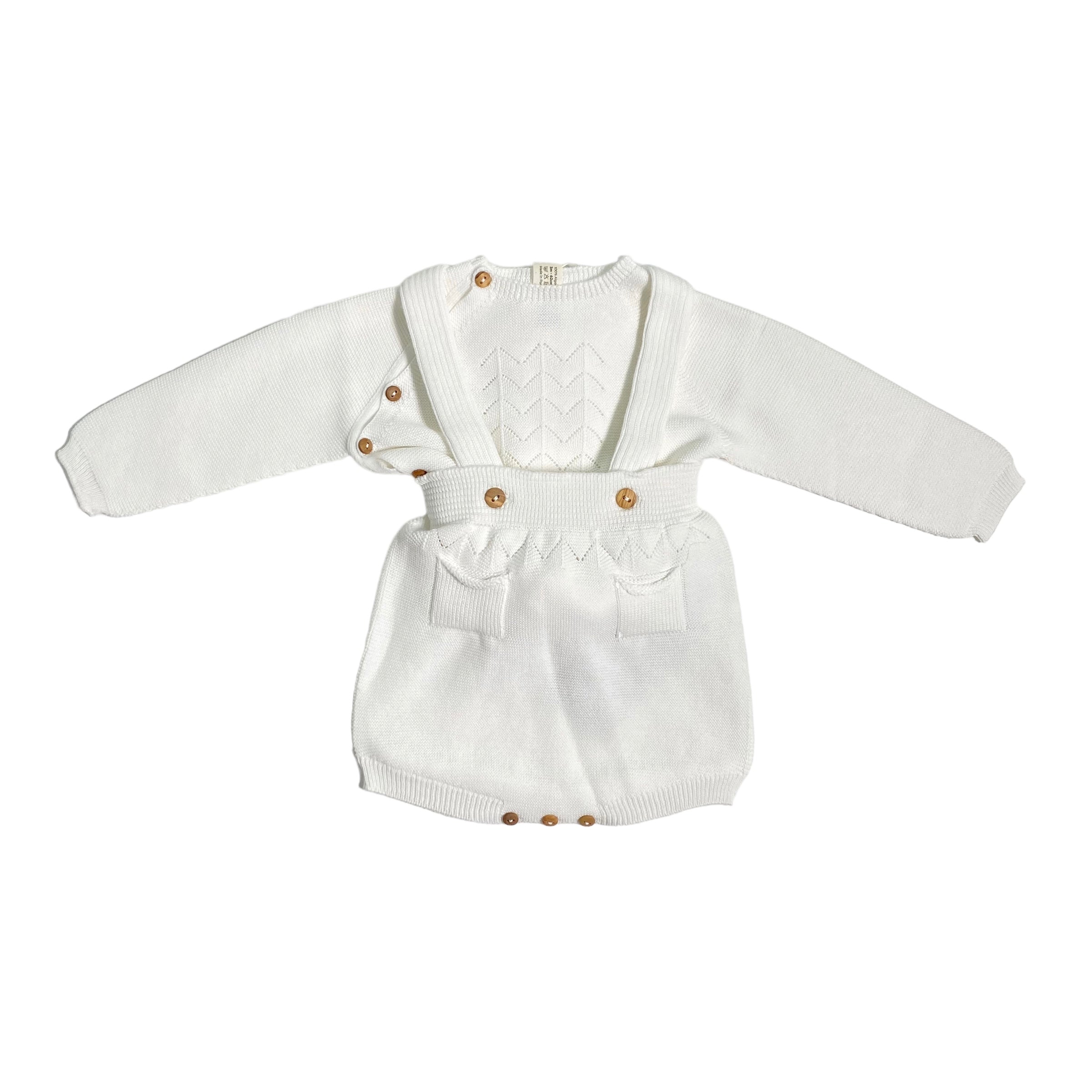 Set aus warmer Bio-Baumwolle in einfarbigem Cremeton, bestehend aus Latzhose mit Hosenträgern und Pullover mit Holzknöpfen, mit Perforationen.