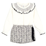 Questo completo due pezzi per bambina unisce eleganza e comfort grazie ai shorts in tessuto operato con effetto gonna e alla camicia in caldo cotone con collo a rouches. Perfetto per un look alla moda e casual, garantisce morbidezza e vestibilità ideale per ogni occasione.