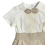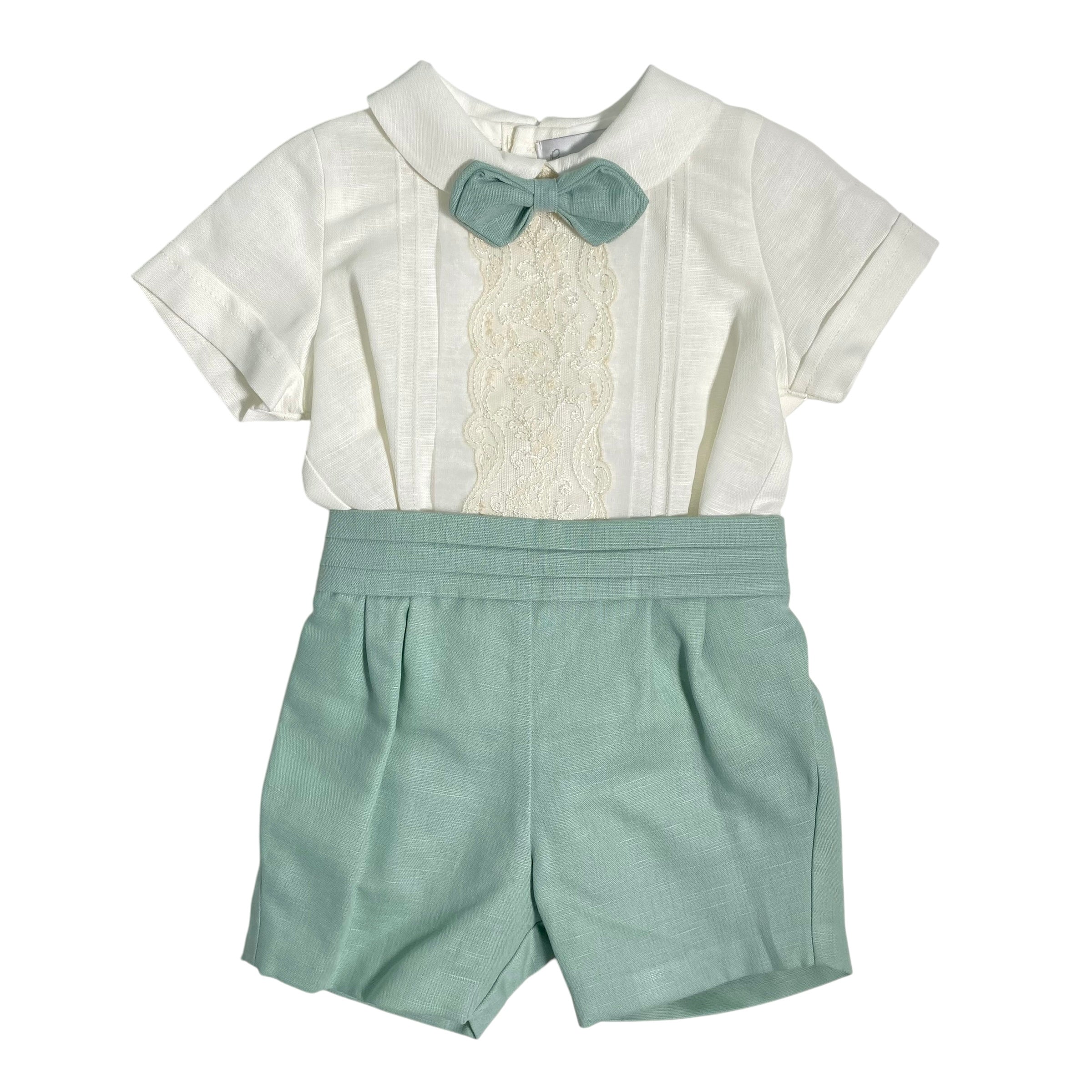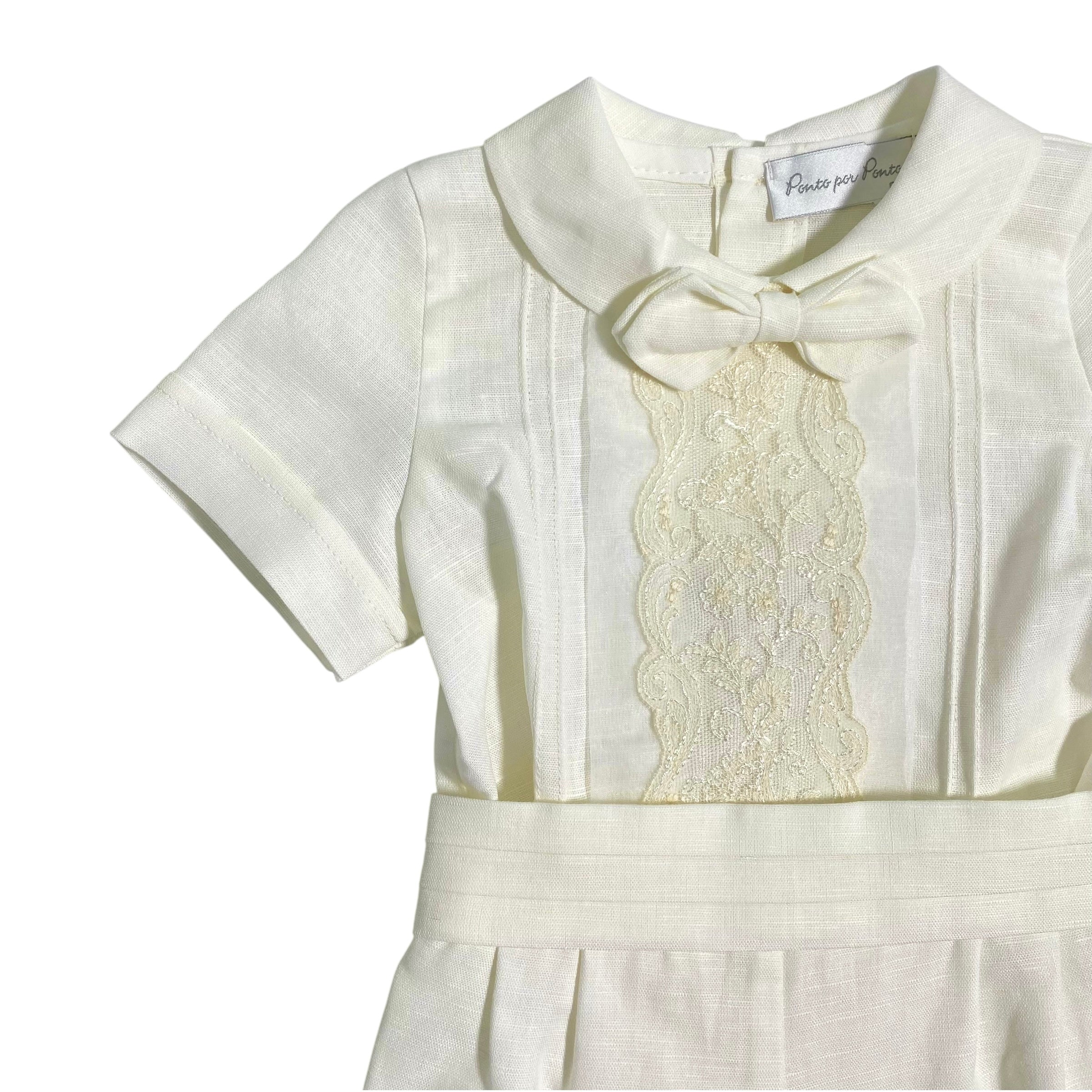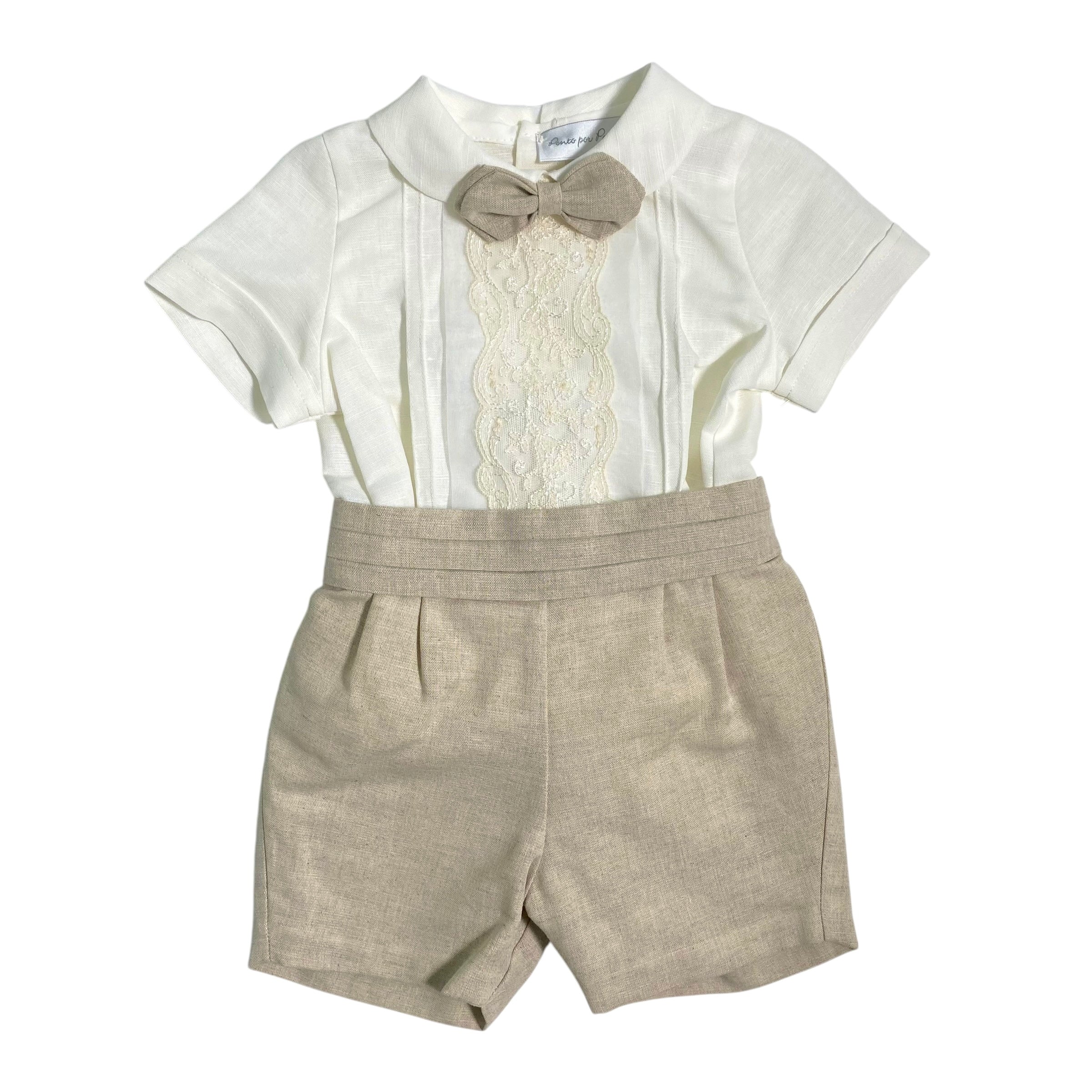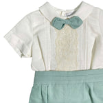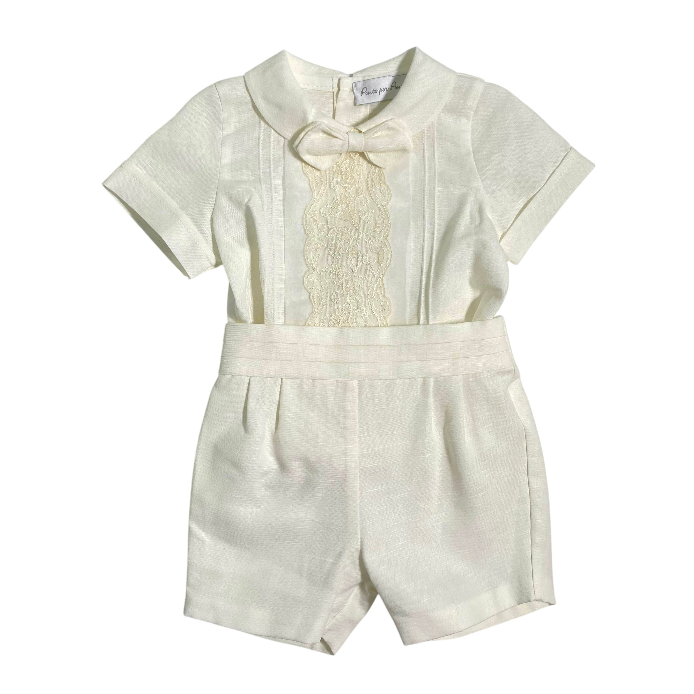 Questo elegante completo in lino è perfetto per le occasioni speciali del tuo neonato. Il bermuda in e la camicia mezza manica sono impreziositi con applicazioni di pizzo sul davanti. Completa il look con il papillon abbinato per un tocco di stile.