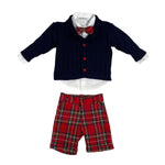 Completo elegante con bermuda con bretelle scozzese, camicia in caldo cotone panna, papillon scozzese dello stesso tessuto del pantalone e cardigan con colletto.