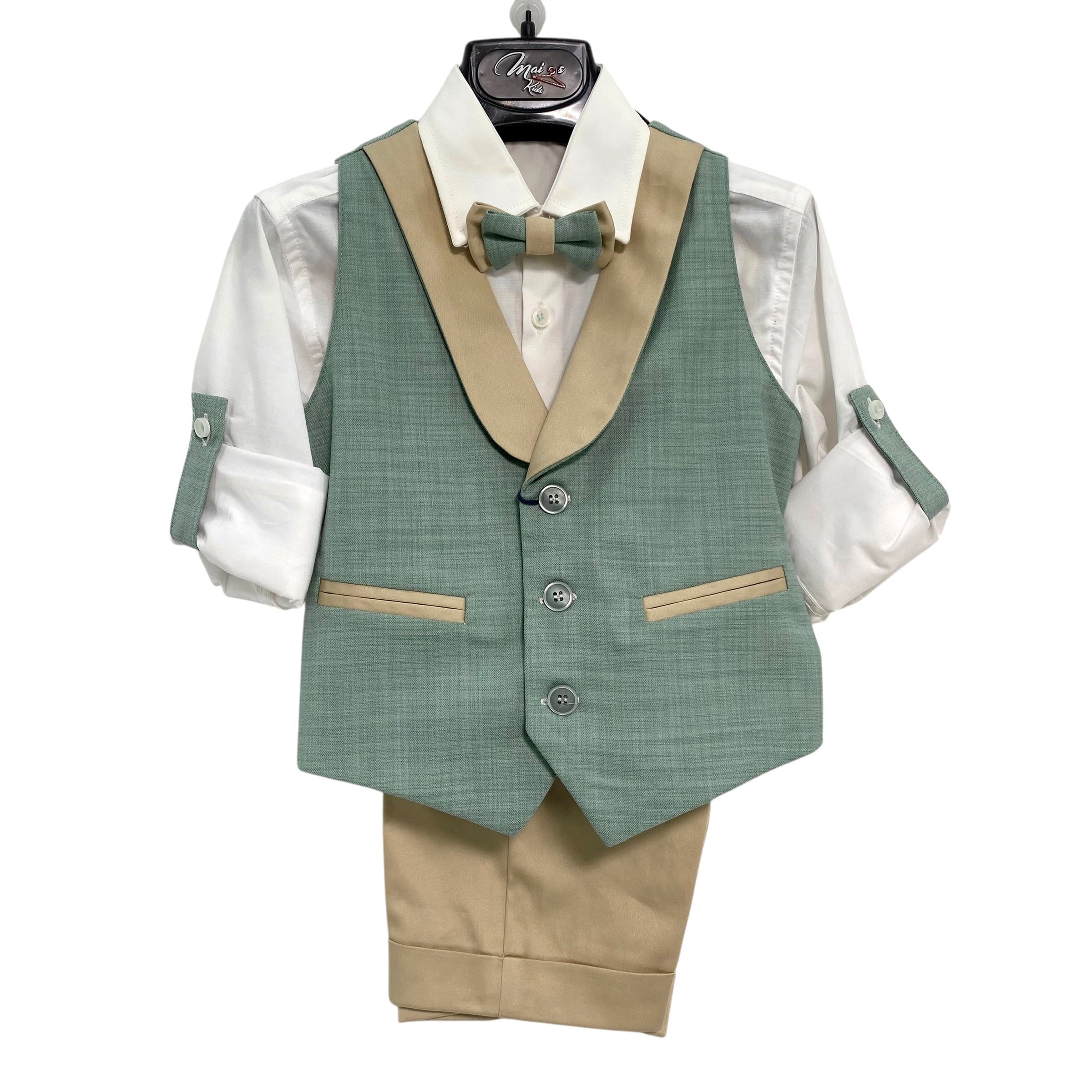 Questo completo elegante per paggetto è composto da bermuda con risvolto, camicia bianca, panciotto con reverse e papillon abbinato. Perfetto per far sentire il tuo bambino un piccolo signore il giorno del matrimonio. Con il suo stile raffinato e dettagli curati, garantirà un aspetto elegante e impeccabile.