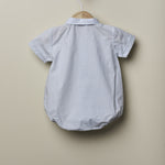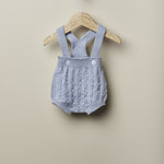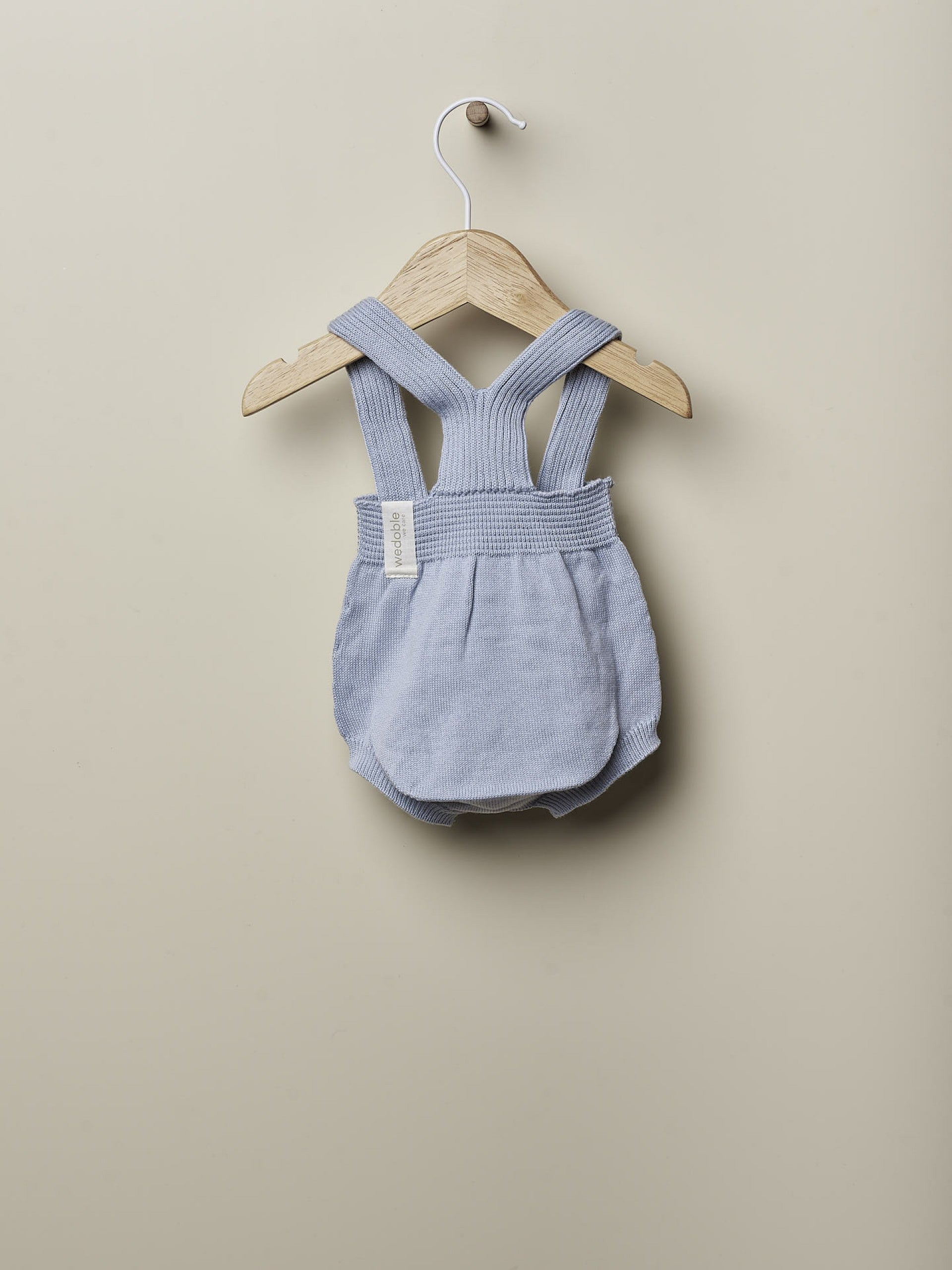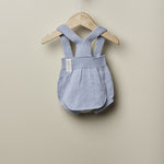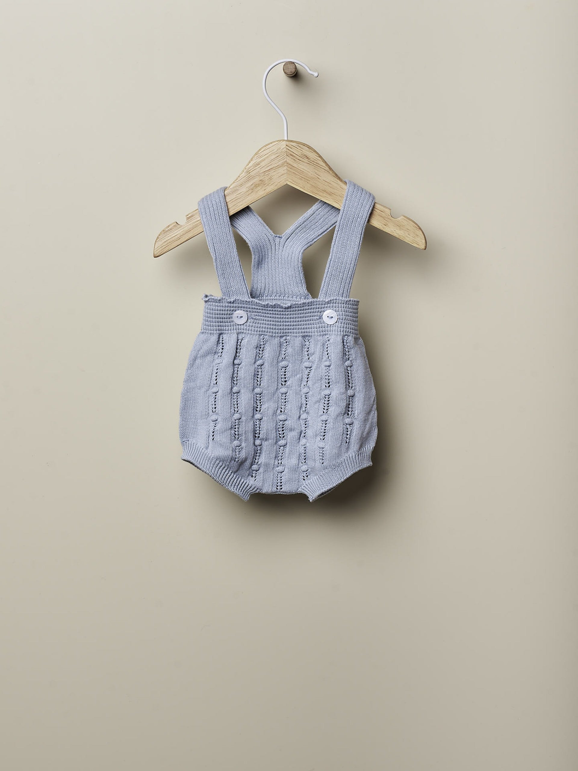 Il Completo Culotte e Camicia Celeste Neonato WEDOBLE V2401305B è composto da 2 pezzi, culotte in filo con bretelle e lavorazioni traforate e una camicia a body in cotone con fantasia a righe e chiusura con bottoni in legno sul davanti e al cavallo.