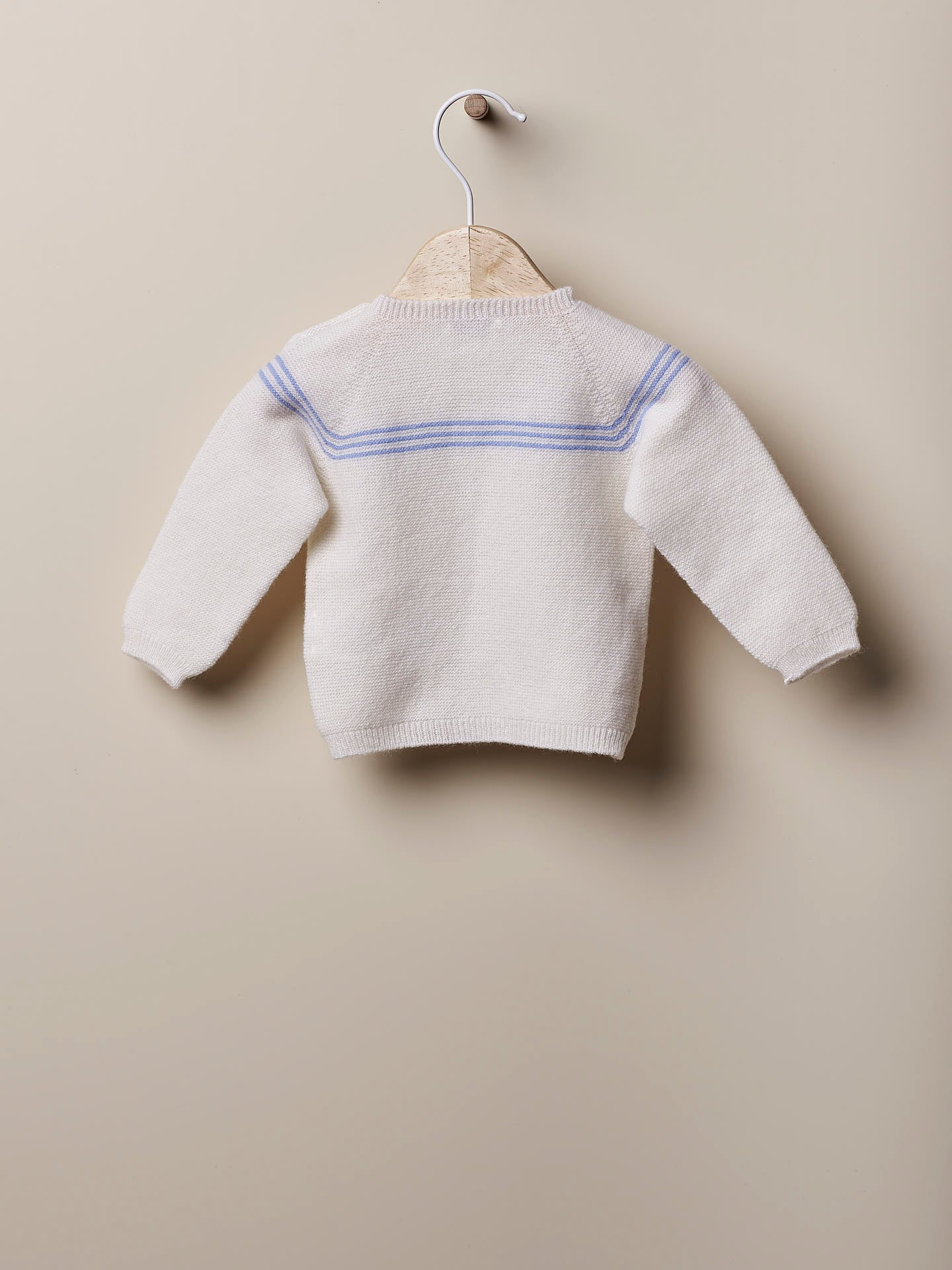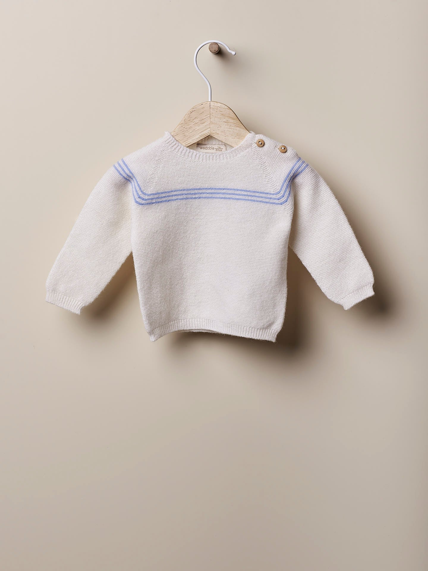 Maglione lavorato a maglia in morbida lana merino extra fine, ottimo per neonati. LOVE IN WINTER DAYS maglione a maniche lunghe si allaccia sulla spalla con bottoni in legno. Realizzato con la tecnologia Wholegarment, questo capo è privo di cuciture per il massimo comfort del tuo bambino.