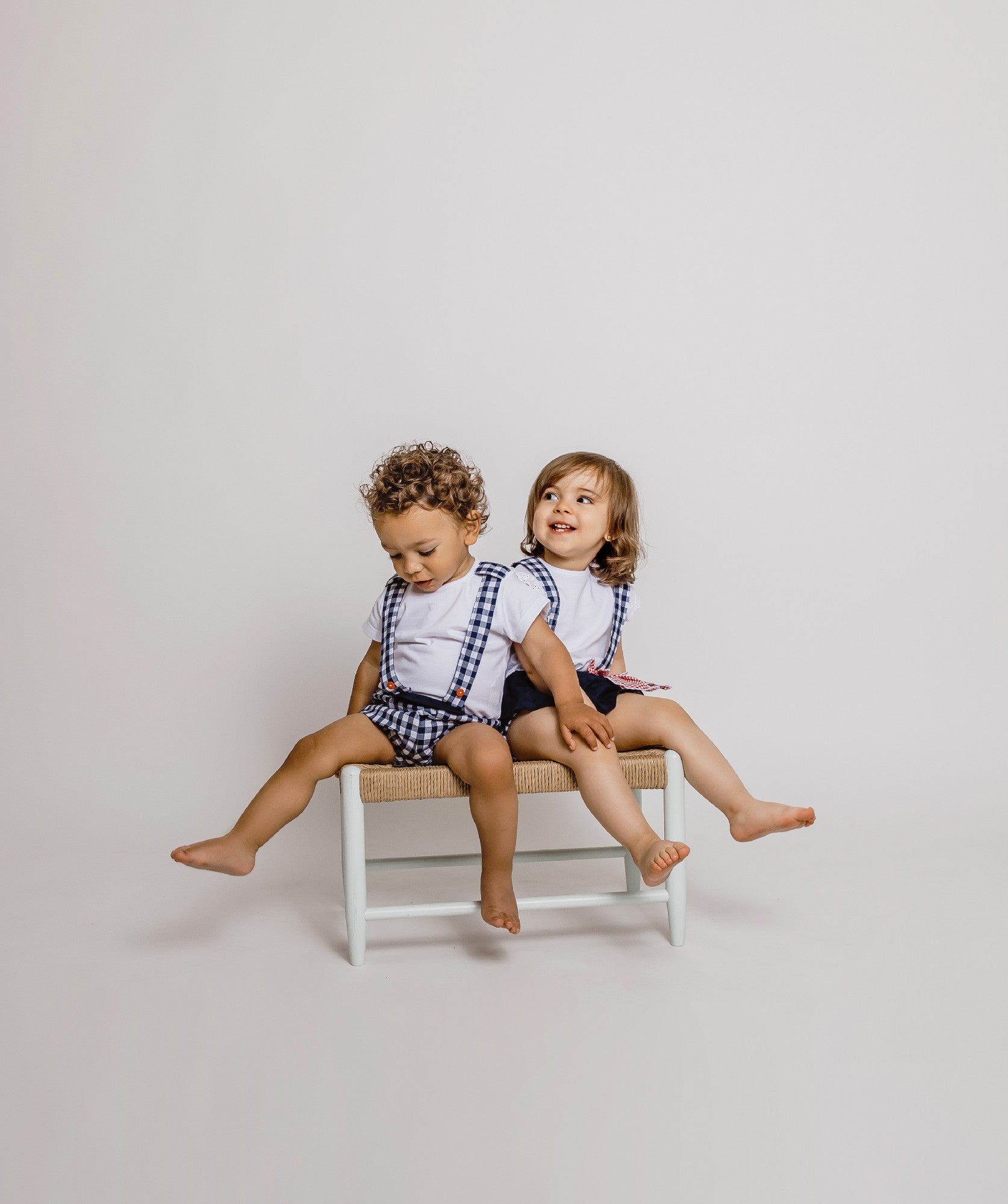 - Culotte mit Hosenträgern aus karierter Baumwolle mit blauem Plumetis-Volant, verziert mit einer roten Gingham-Schleife an der Seite