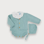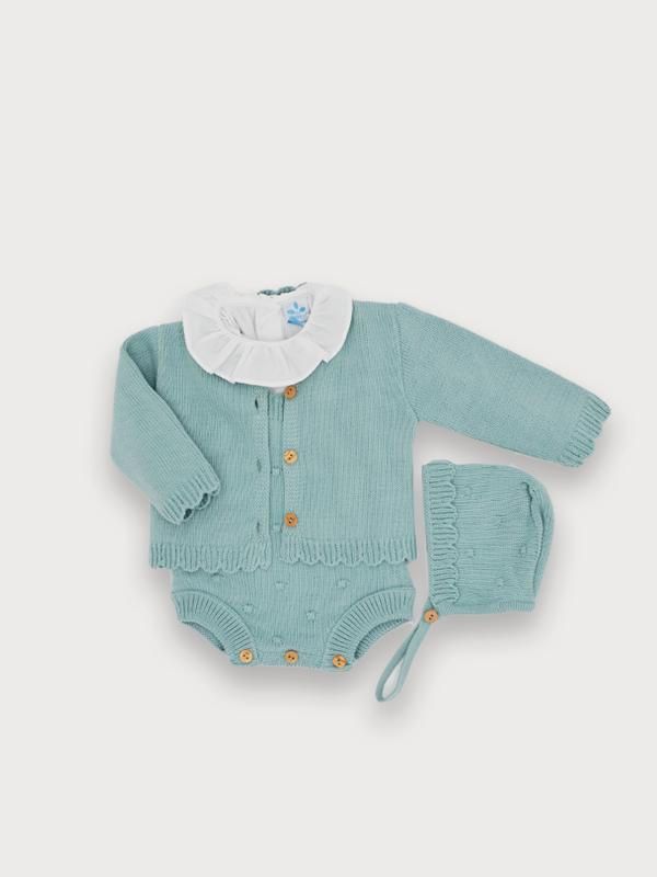 Questo completo quattro pezzi in tessuto anallergico è composto da un pagliaccetto con poise a rilievo, una camicia con collo volant in cotone, un cardigan con bottoncini in legno e una cuffia abbinata. Perfetto per l'uscita clinica, è alla moda e garantisce comfort e sicurezza per il neonato.