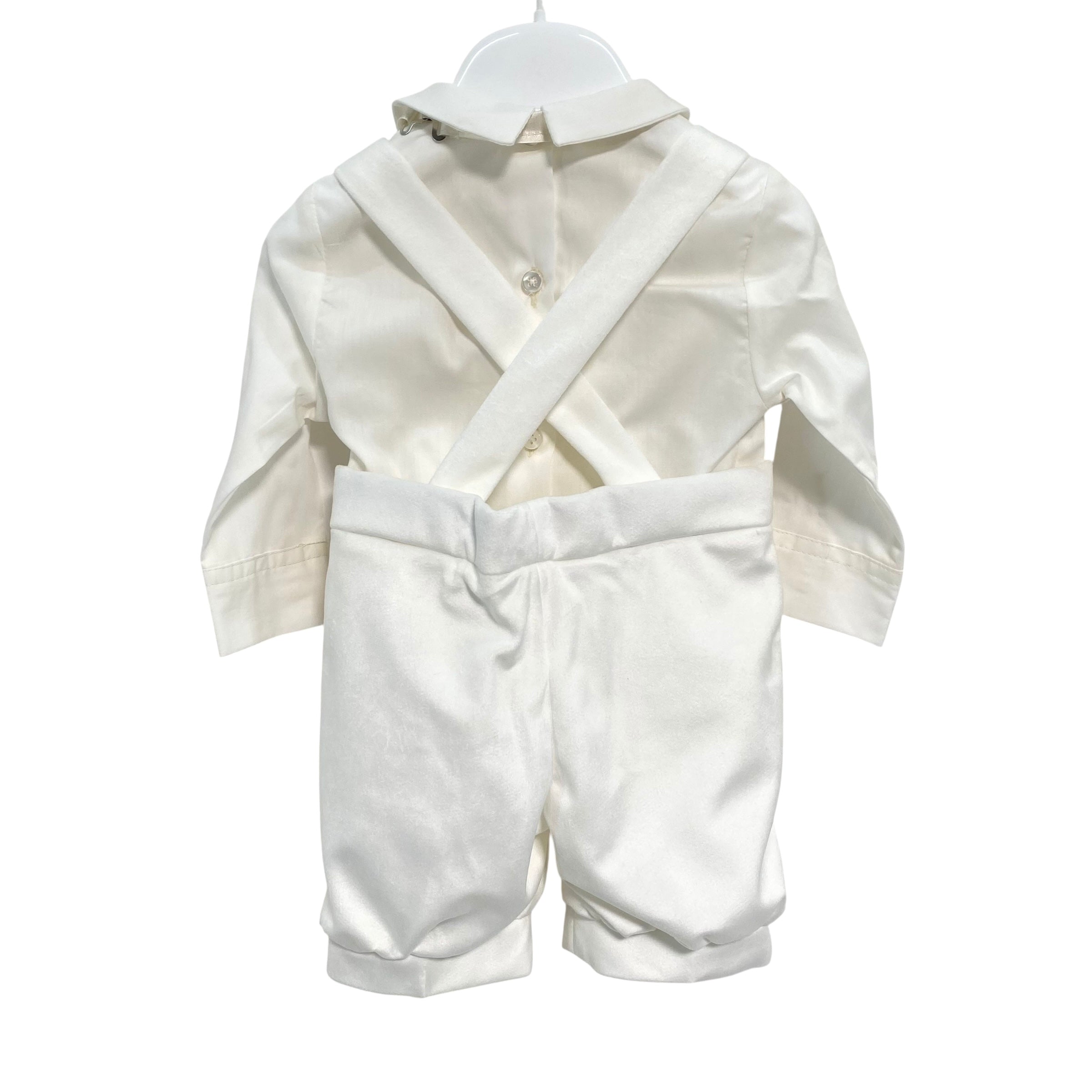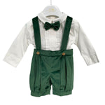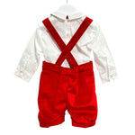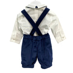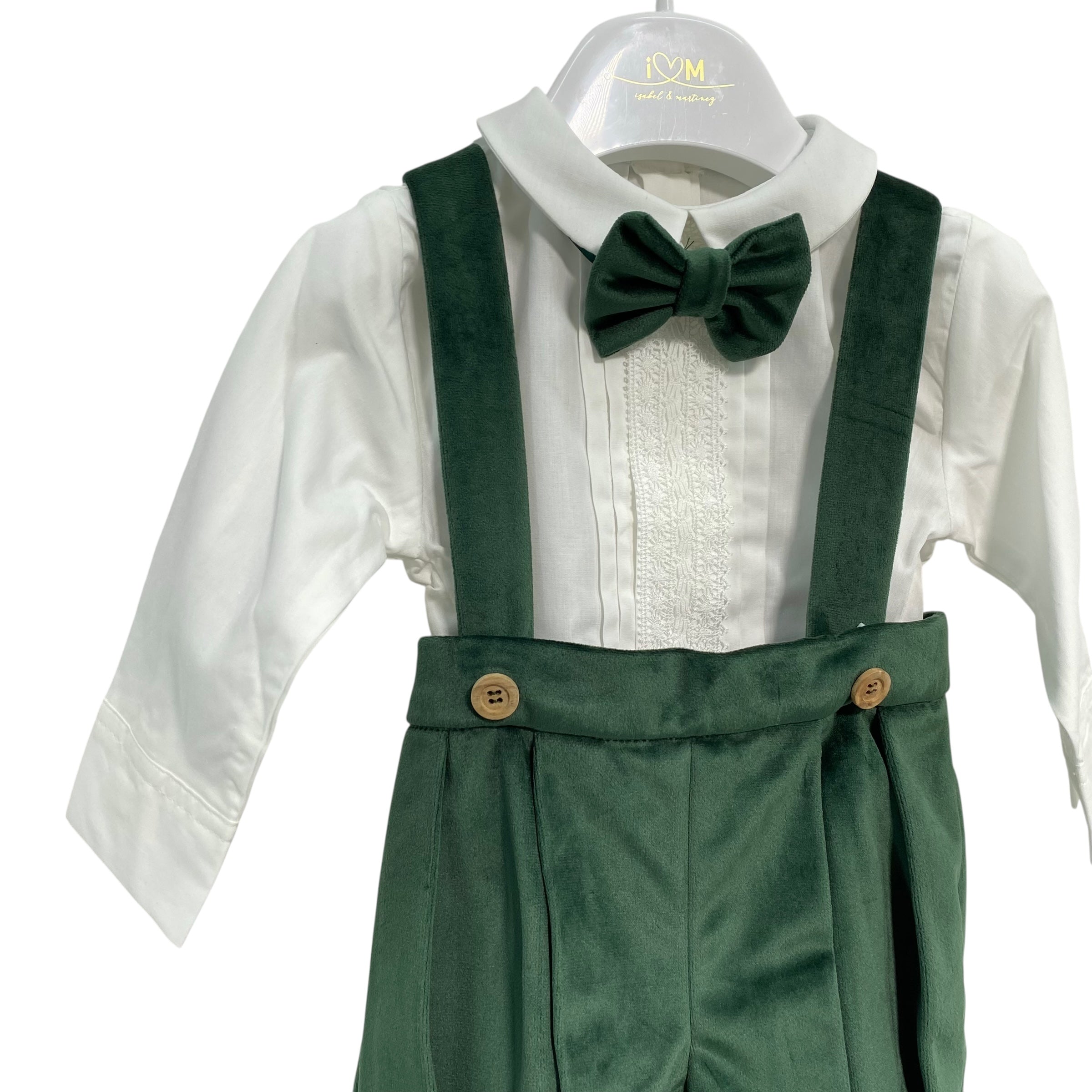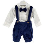 Completo elegante tre pezzi per neonati, con salopette a pagliaccio in velluto, camicia bianca in cotone con lavorazione sul davanti e papillon in velluto. Perfetto per occasioni speciali, dona un tocco di eleganza al tuo bambino. Realizzato con materiali di qualità per il massimo comfort e stile.
