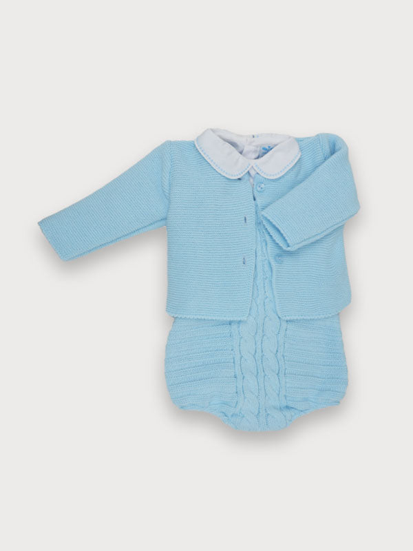 Questo completo tre pezzi in tessuto anallergico è composto da un pagliaccetto, una camicia con collo tondo ricamato in cotone e un cardigan con bottoncini. Perfetto per l'uscita clinica, è alla moda e garantisce comfort e sicurezza per il neonato.
