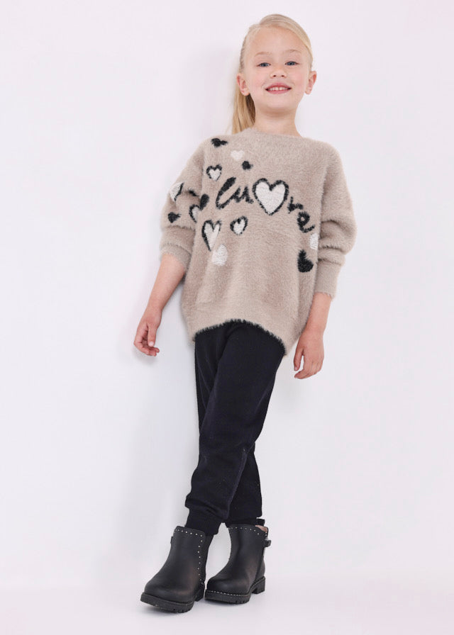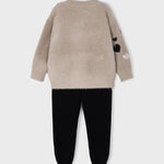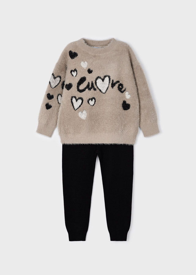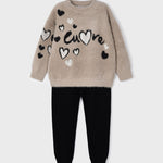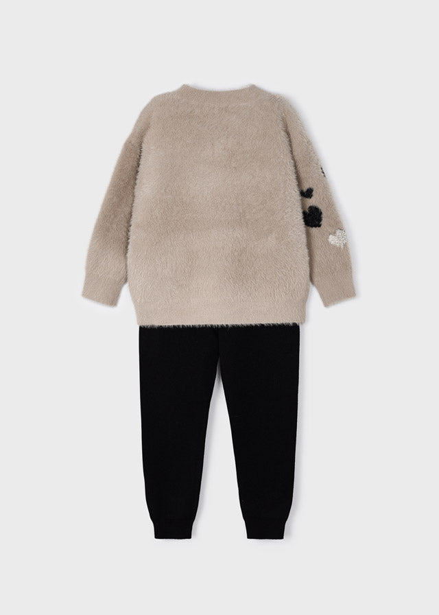 Trikotset mit einfarbigen schwarzen Leggings und Plüsch-Sweatshirt.