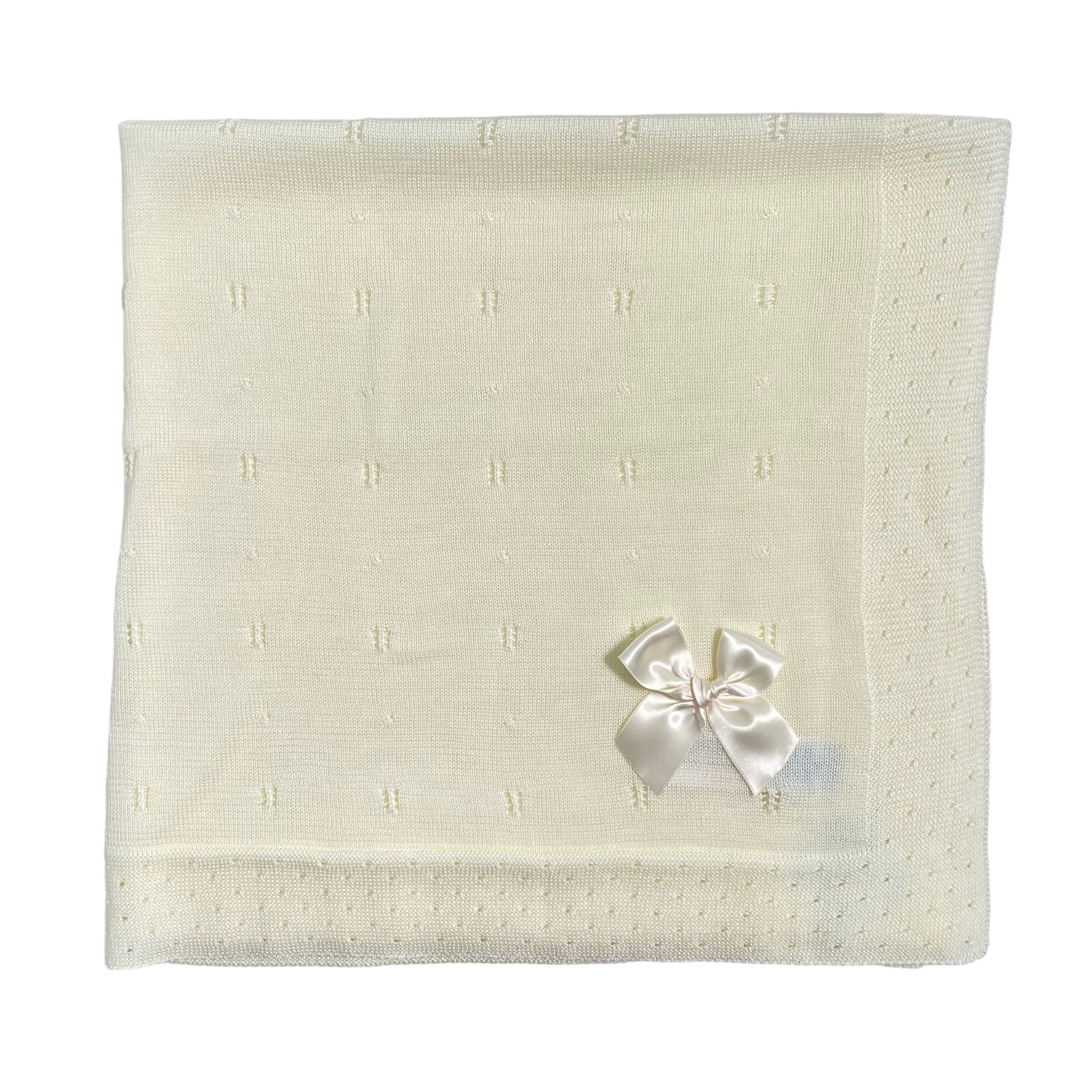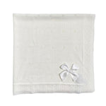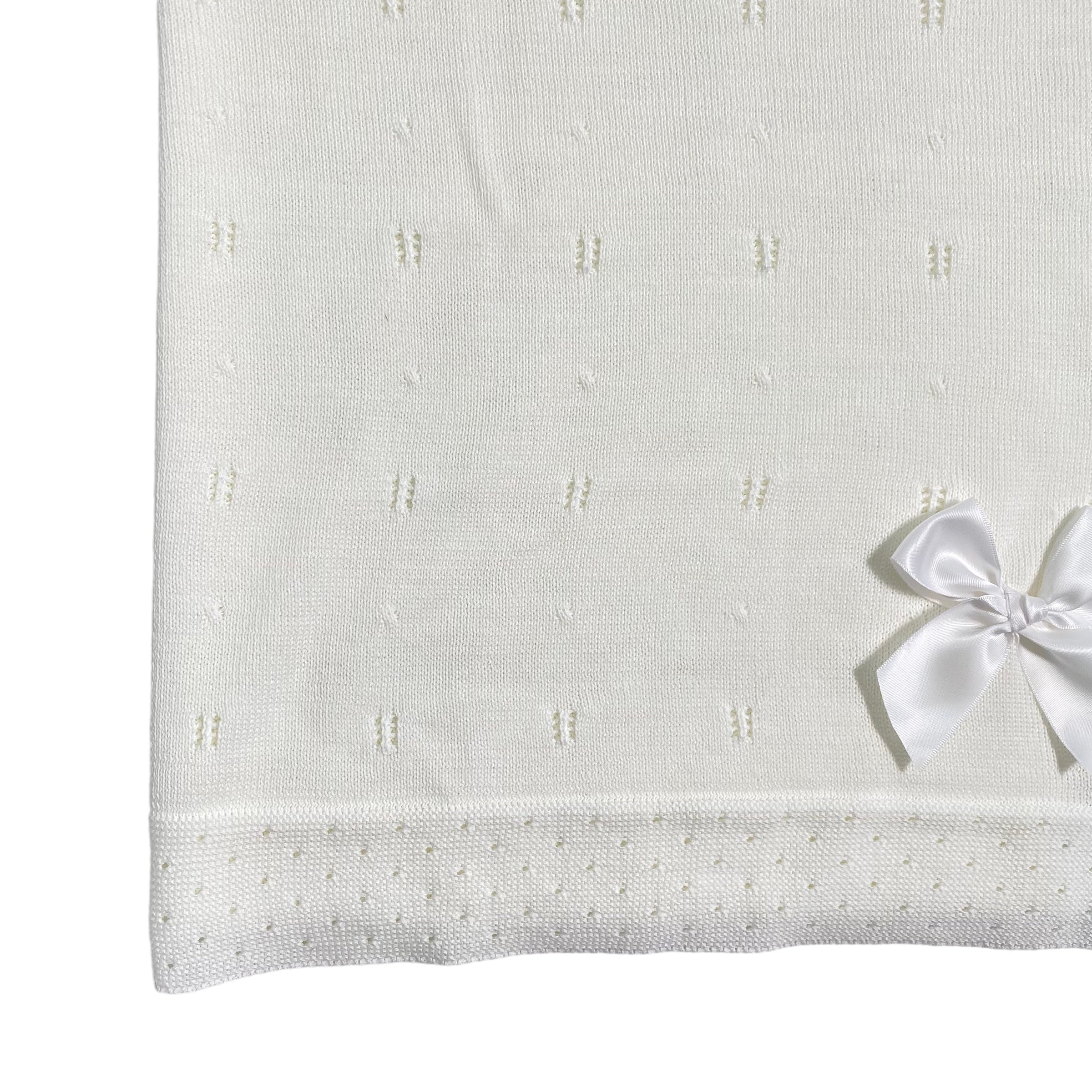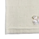 Proteggi il tuo neonato con stile, con la nostra coperta elegante in tessuto anallergico acrilico. Perfetta per tenere il tuo piccolo/a caldo/a e confortevole, grazie alla sua lavorazione traforata e al fiocco in raso che lo rende ancora più elegante.