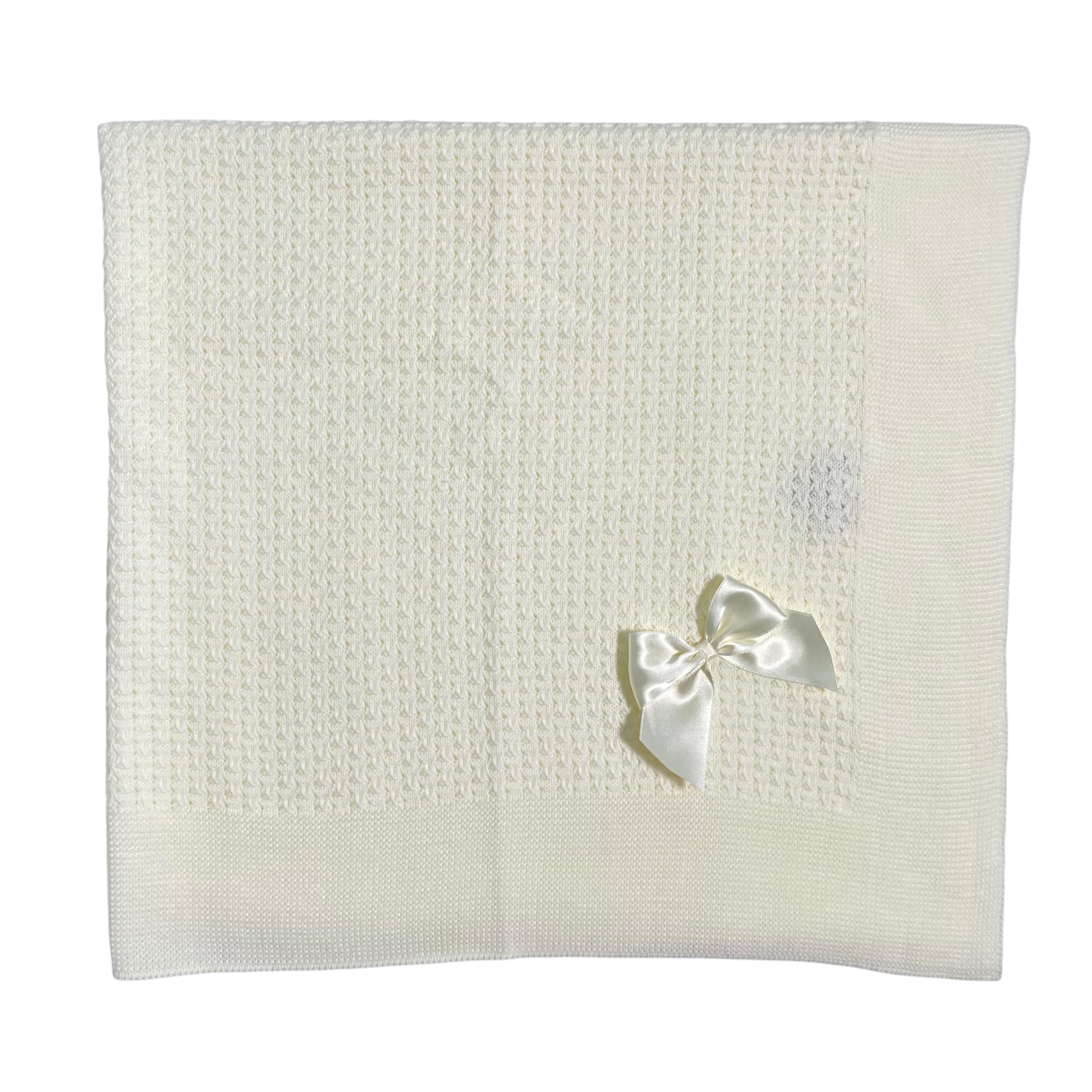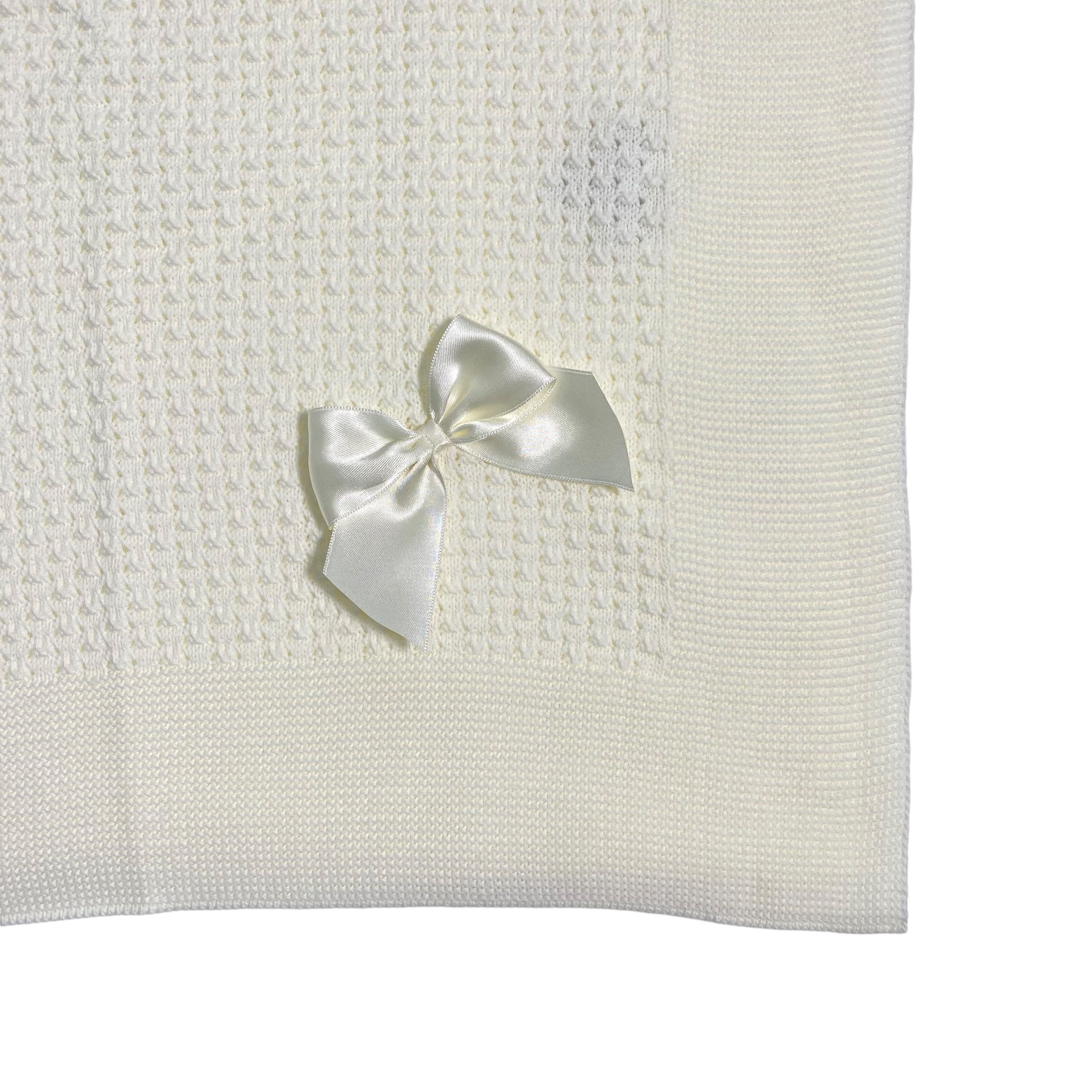 Questa coperta elegante in tessuto anallergico in acrilico è la scelta ideale per la tua bambina. Con una bellissima trama centrale, un fiocco in raso e un design elegante, questa coperta è perfetta per il suo corredino. Assicura comfort e qualità grazie ai suoi materiali anallergici.