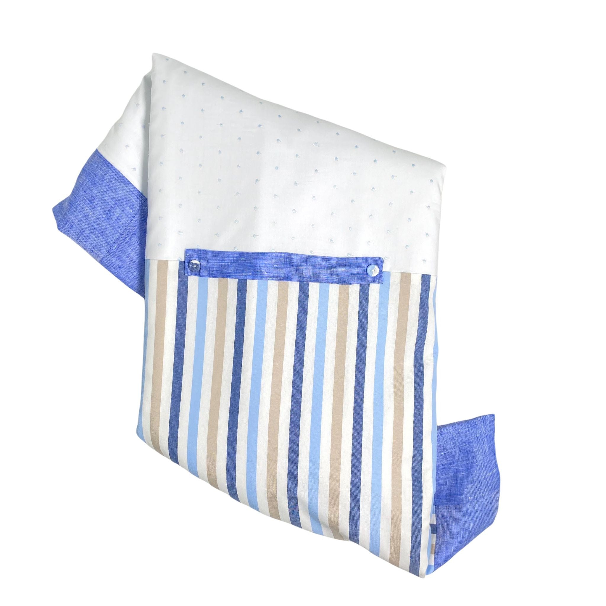 White cotton blanket with light blue polka dots, with light blue and beige striped linen border.