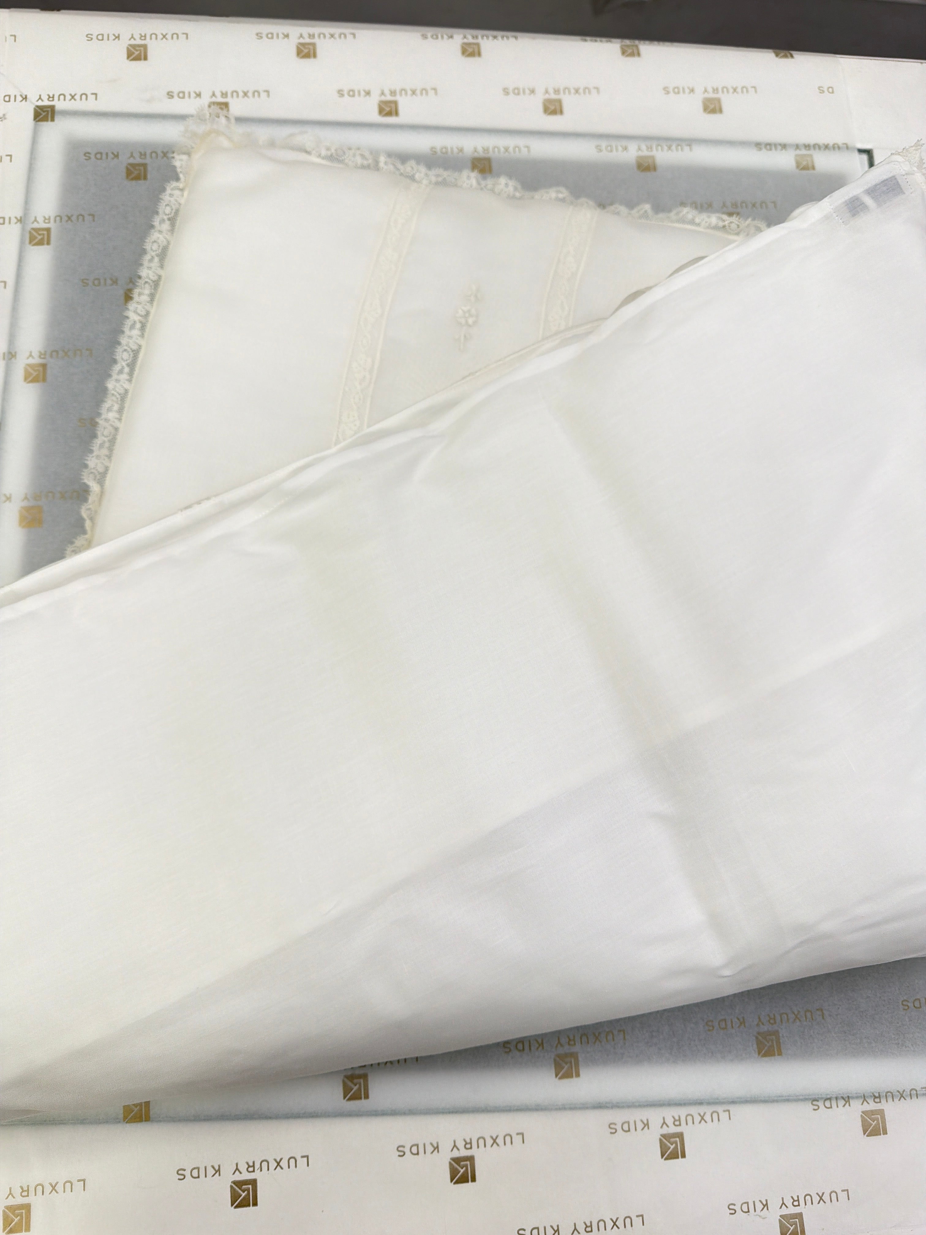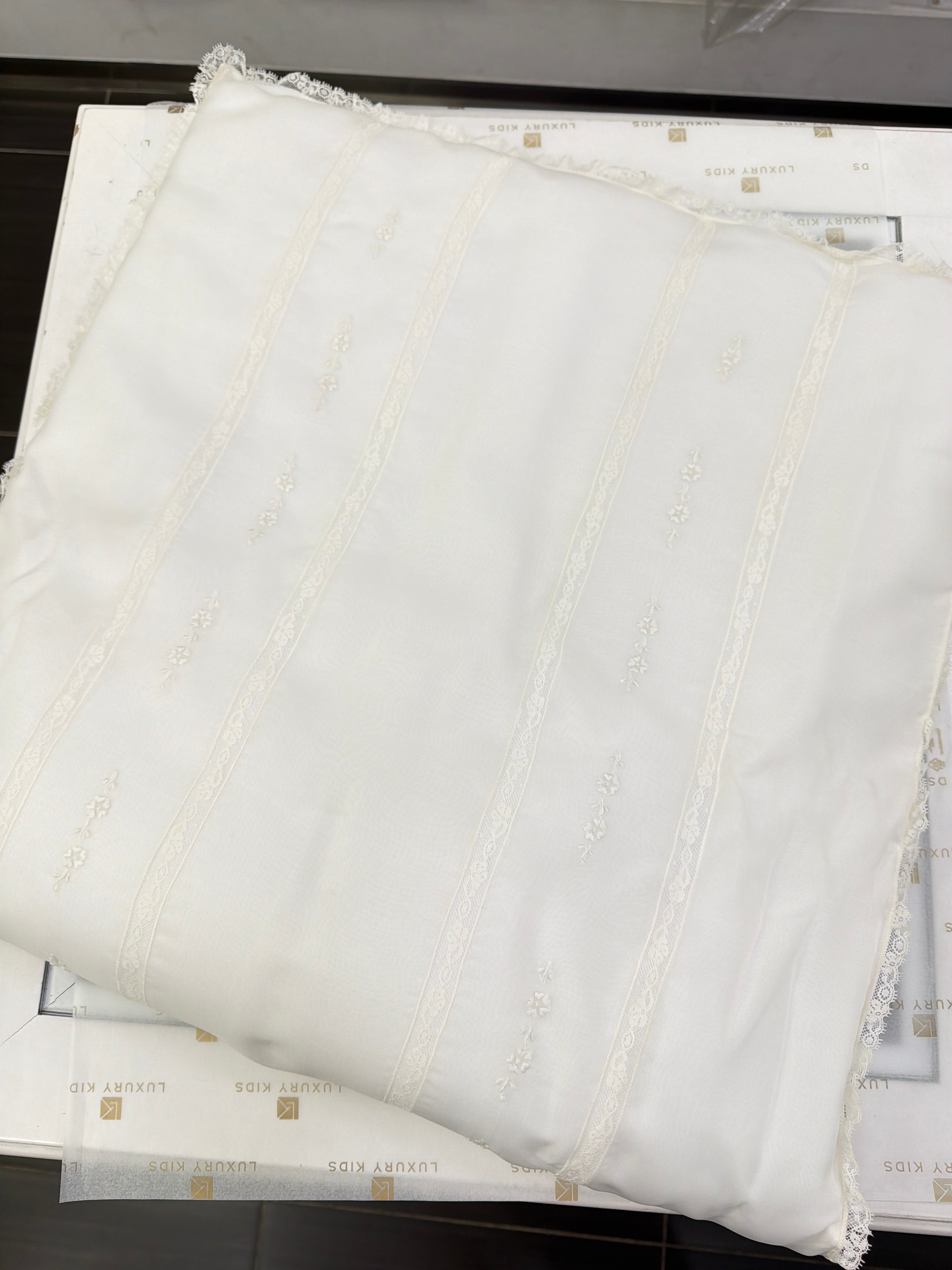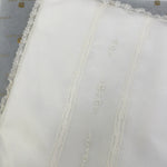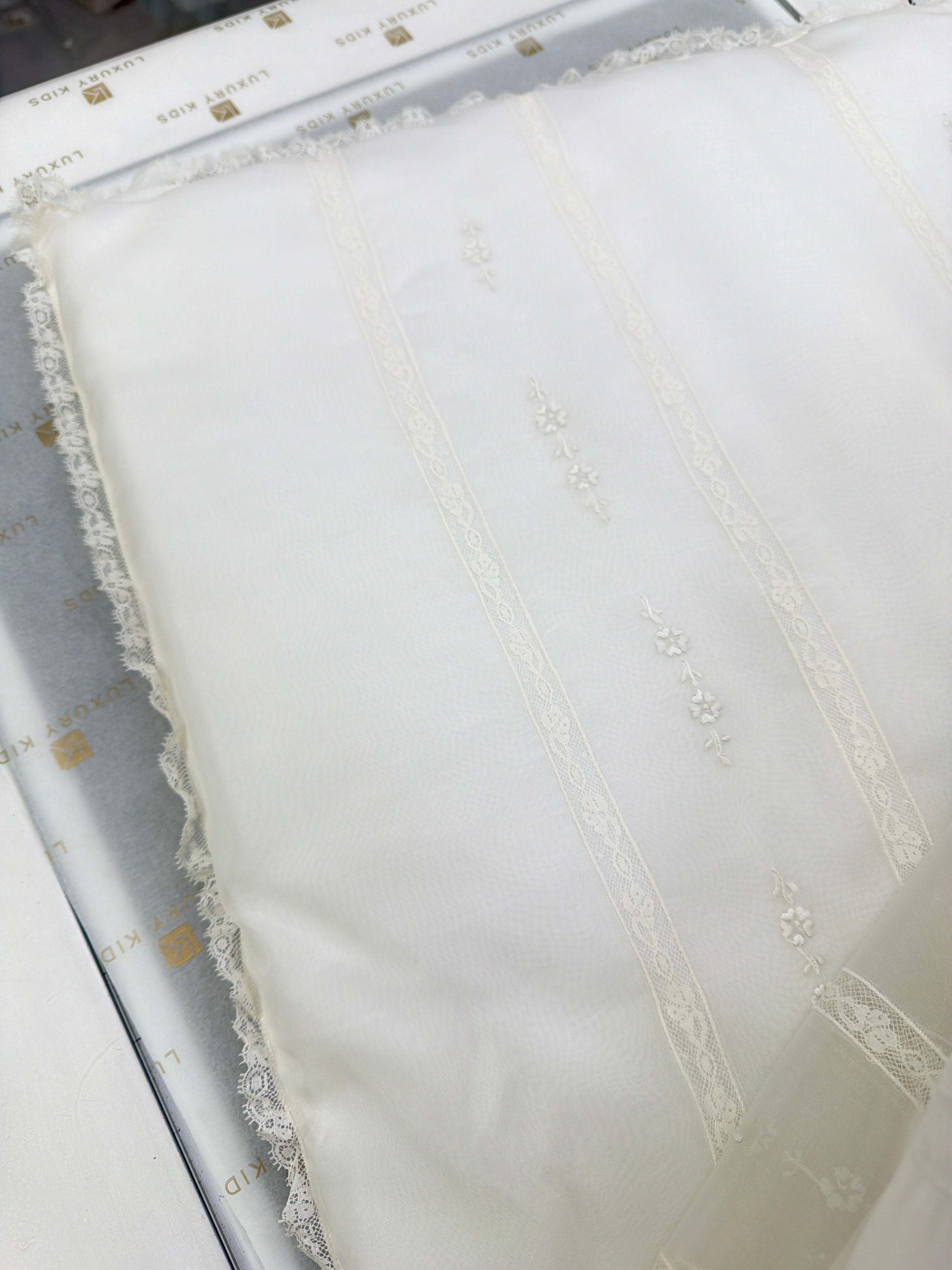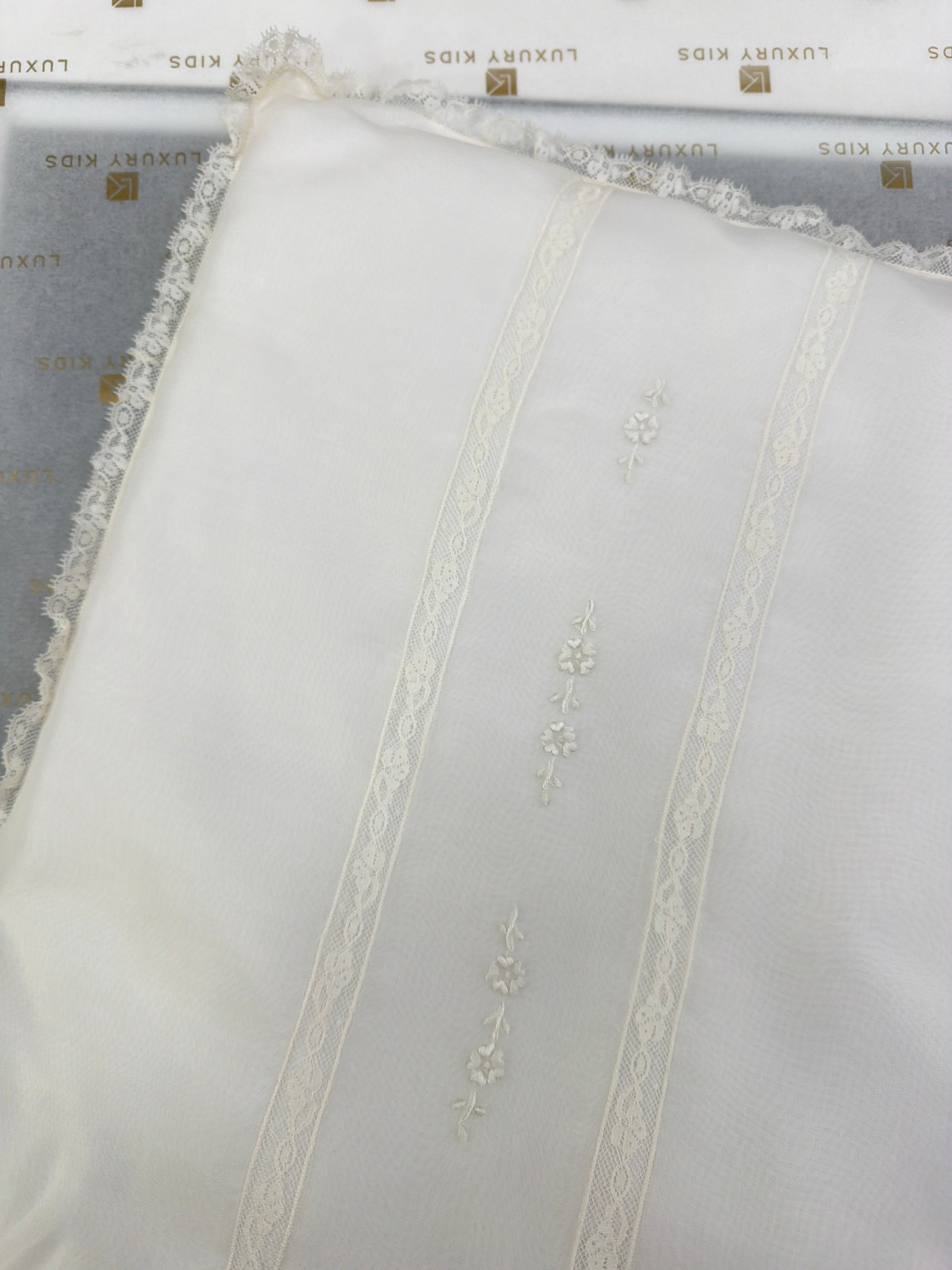 Abnehmbarer gepolsterter Bezug aus Seidenorgandis, Spitzenbesatz und Stickerei auf der Vorderseite.