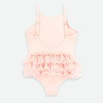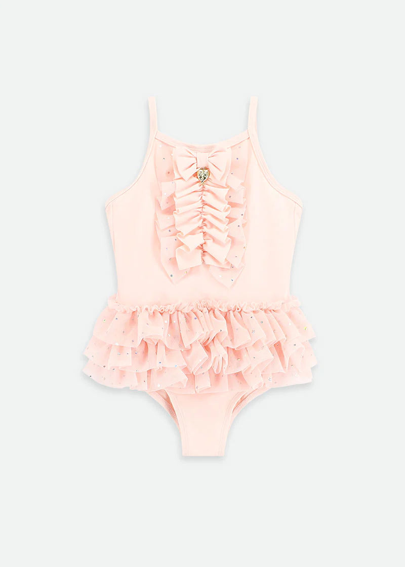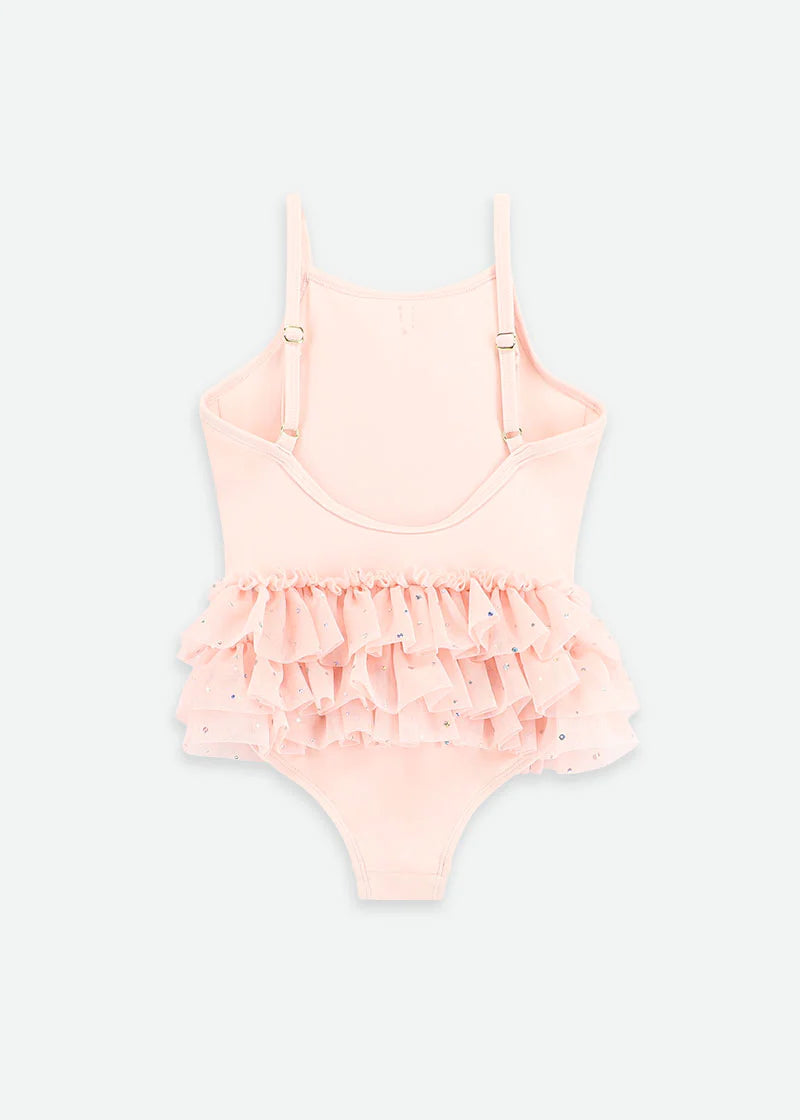 Grazioso costume da bagno in rosa pallido con balza sul petto e volant a strati in tulle rosa scintillante. Le spalline sono dotate di regolatori per una vestibilità perfetta. Si chiude con una fibbia sul retro. Completamente foderato per garantire la massima modestia. SPF 50