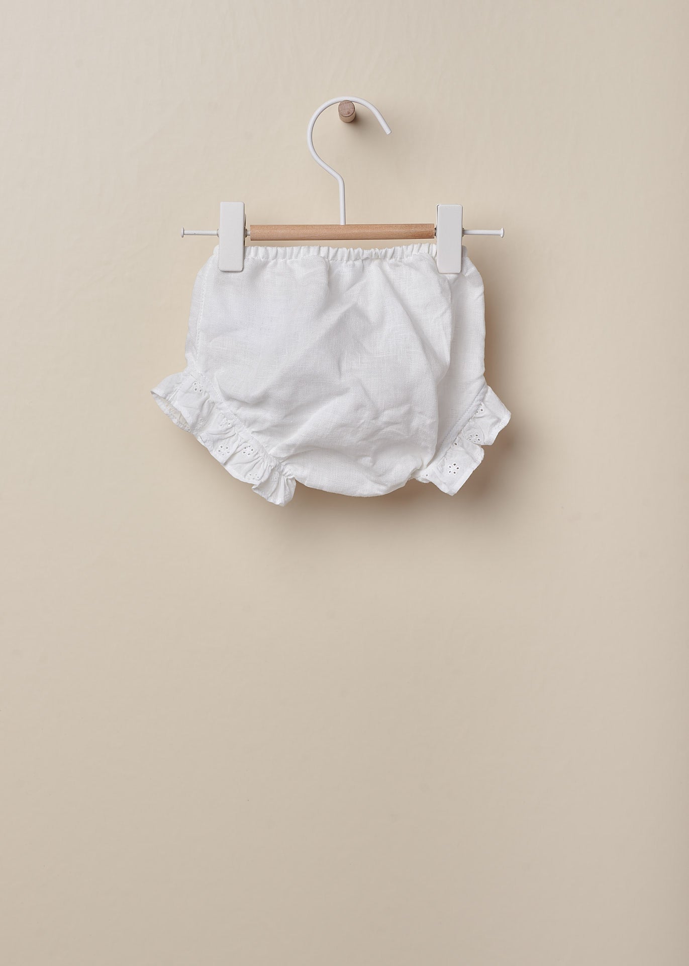 Gathering on the waist and on the legs. it is embellished on the legs with a ruches in San Gallo lace