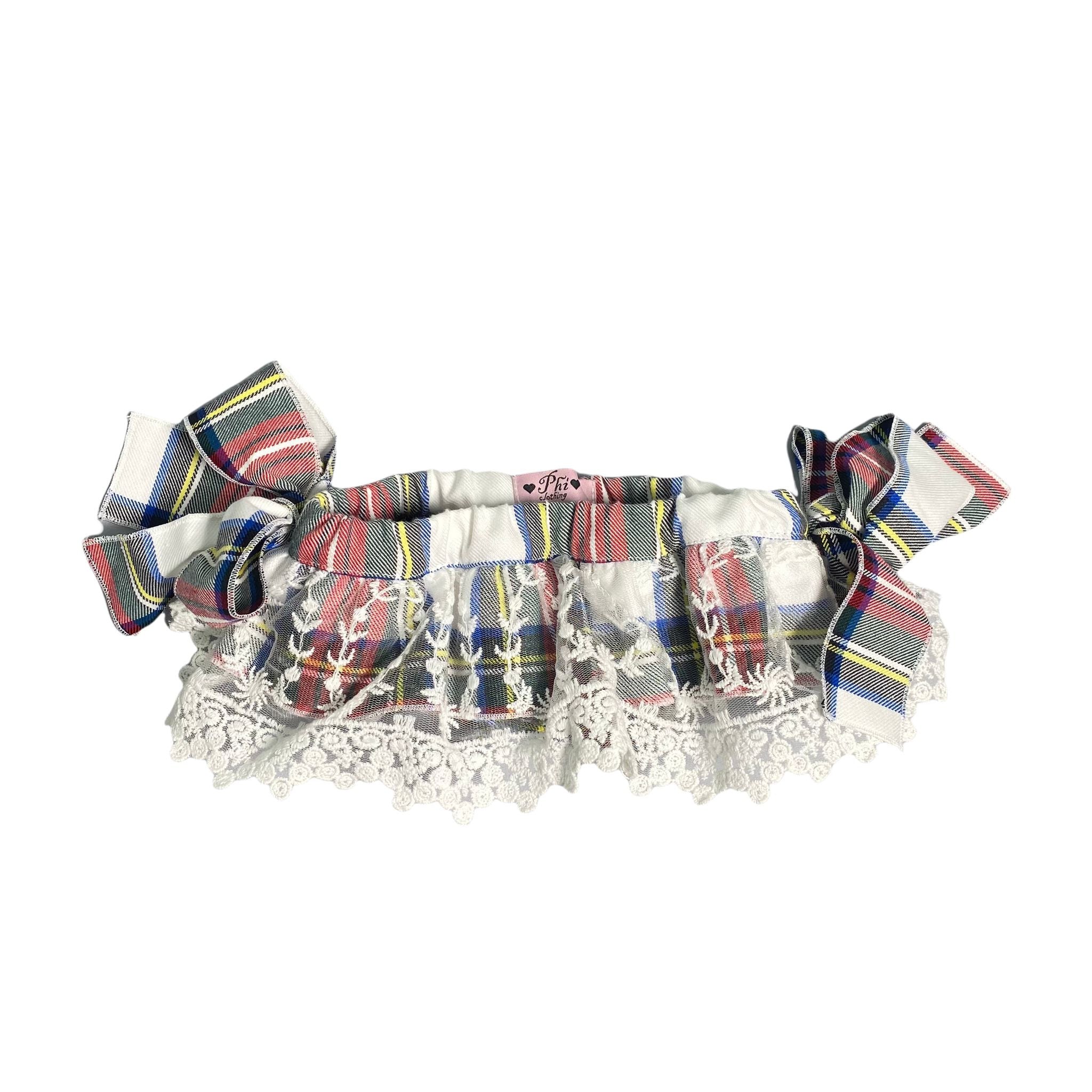 Skirt-effect culottes with side bows for baby girls, featuring a tartan pattern with a dominant blue color.