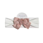 Stirnband aus warmer, cremefarbener Stretch-Baumwolle mit rosa Satinschleifenapplikation und Kunstpelzblume.