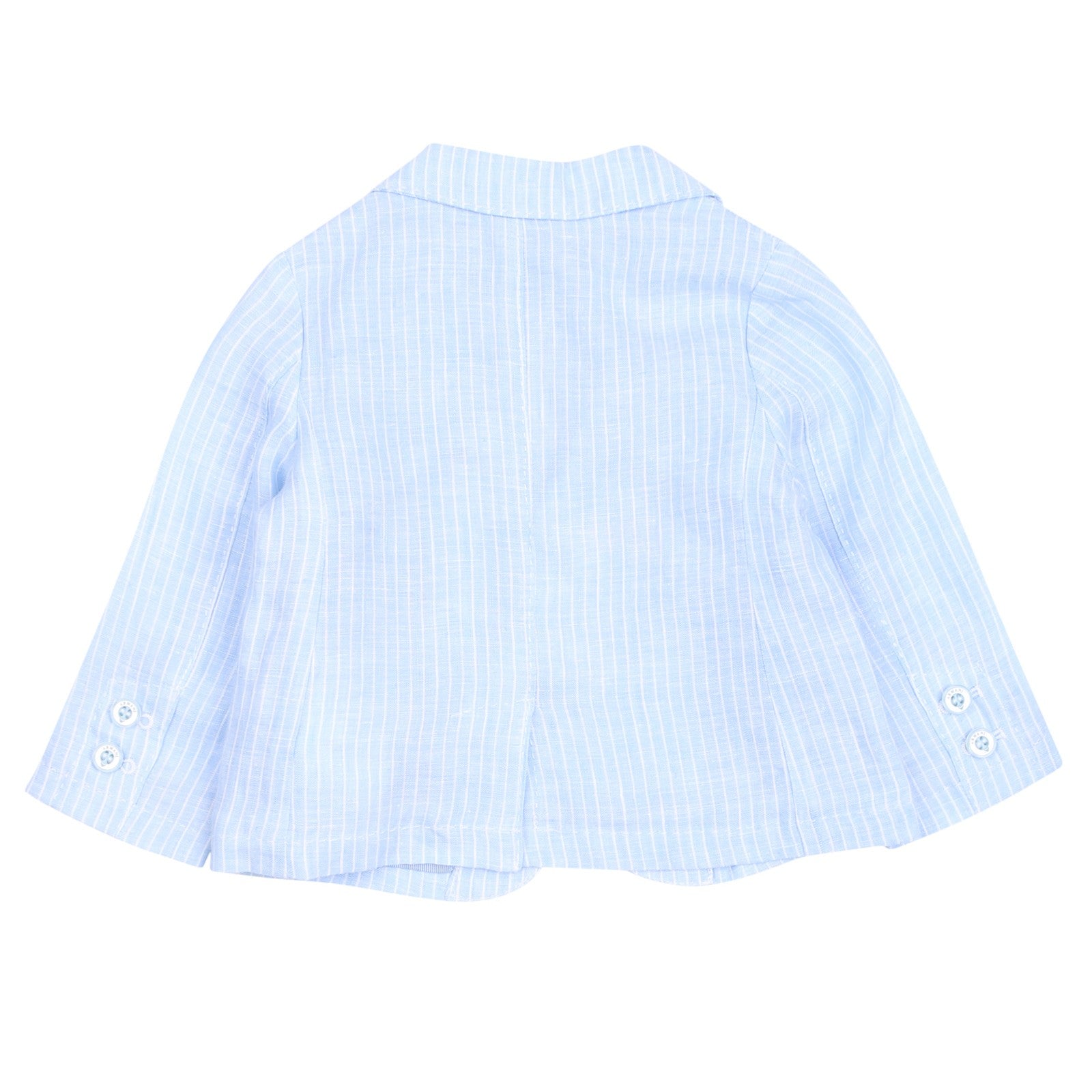 Very soft jacket in cotton linen blend with white and light blue striped Armani pattern, side clutch and pockets on the front.