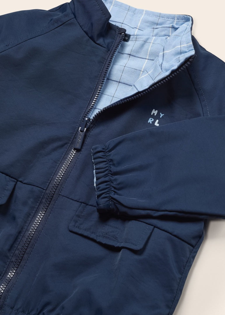 Langarm-Windjacke für Babys. Wickelkragen. Zentraler Reißverschluss. Funktionelle Taschen auf der Vorderseite. Modell mit reversiblem Design.