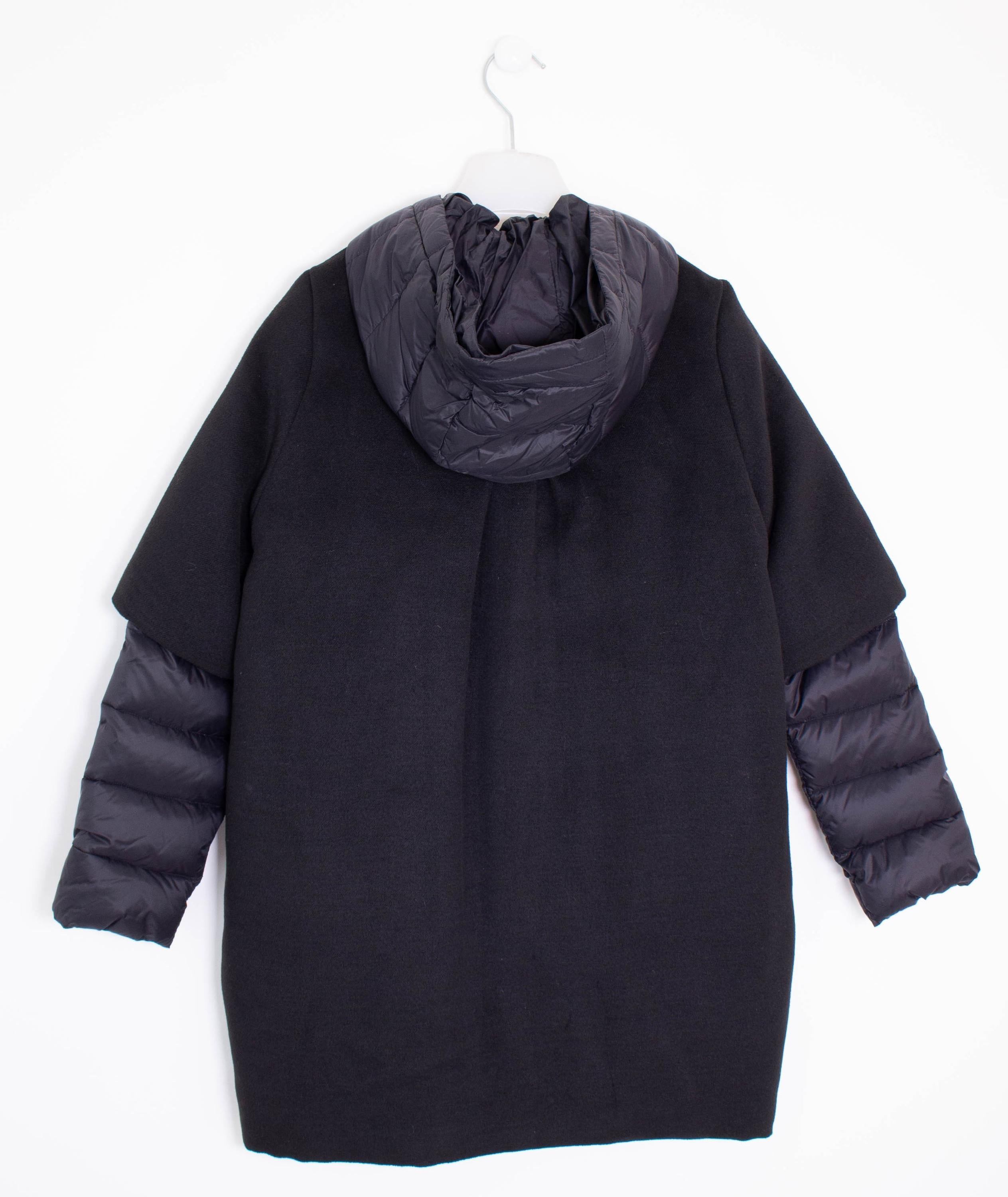 Plain black quilted quilted jacket with overlying cloth half sleeve coat.
