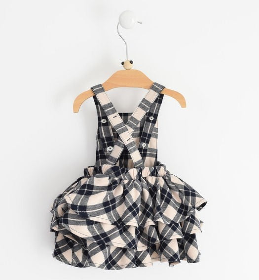 One of the must-haves of the fall winter collection signed by Minibanda is this newborn dungaree skirt in check fabric in honey and blue shades with flounced skirt, elastic waistband and straps. Above the knee length