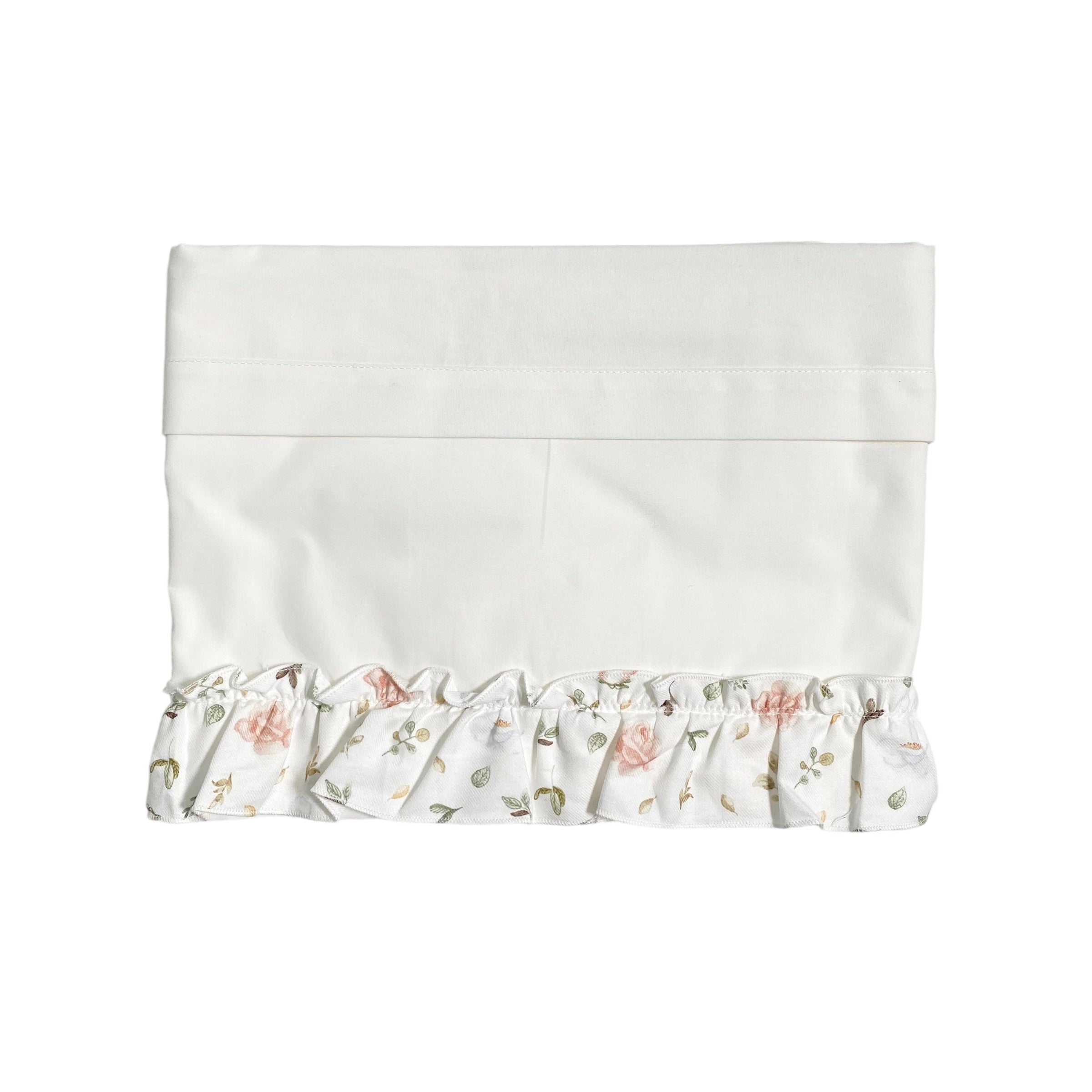 Kinderwagenlaken aus Baumwolle, einfarbig, cremefarben, mit floraler Rüschenapplikation auf der Vorderseite.