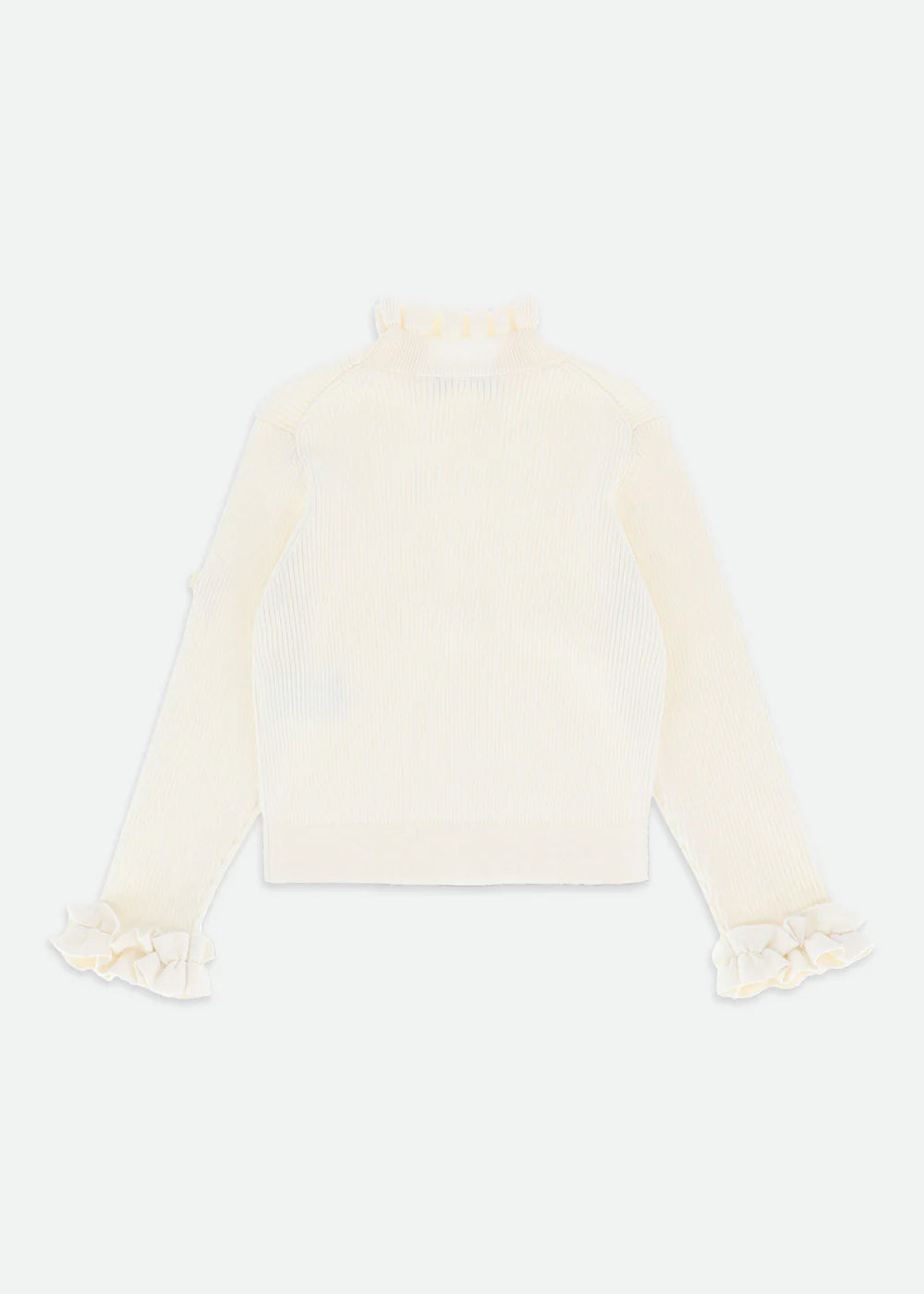 Maglione color vaniglia a coste graziose con dettagli volant. Realizzato in morbidissima maglia di cotone, questo maglione è rifinito con una balza sul collo e sui polsini. Presenta il nostro caratteristico fiocco e il ciondolo a cuore dorato sulla manica.