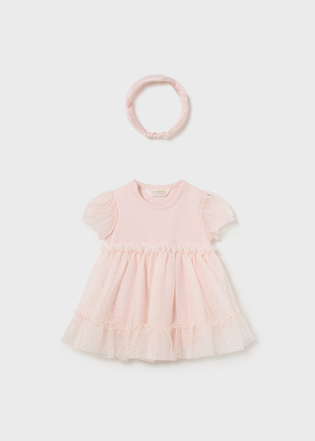 Pagliaccetto manica corta per neonata. Chiusura con bottoni a pressione nell'interno cosce per agevolare la vestibilità. Chiusura con bottoni sulle spalle. Confezione in tulle leggero e vaporoso. Elementi decorativi: ricamo.