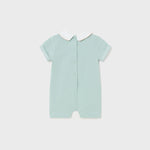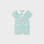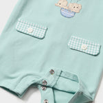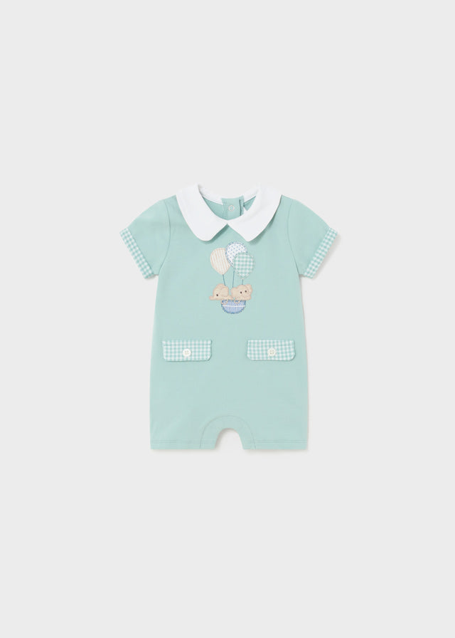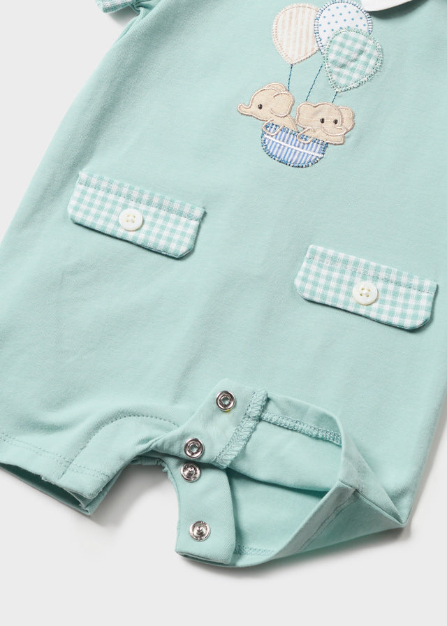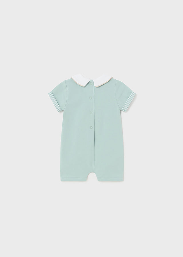 Pigiama manica corta per neonato. Colletto modello camicia. Chiusura con bottoni a pressione nella parte posteriore che facilitano la vestibilità del capo.