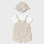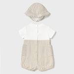 Pagliaccetto manica corta per neonato. Modello con finta salopette sovrapposta. Chiusura con bottoni sulla schiena per facilitare la vestibilità del capo. Chiusura con bottoni nell'interno cosce. Trama a righe.