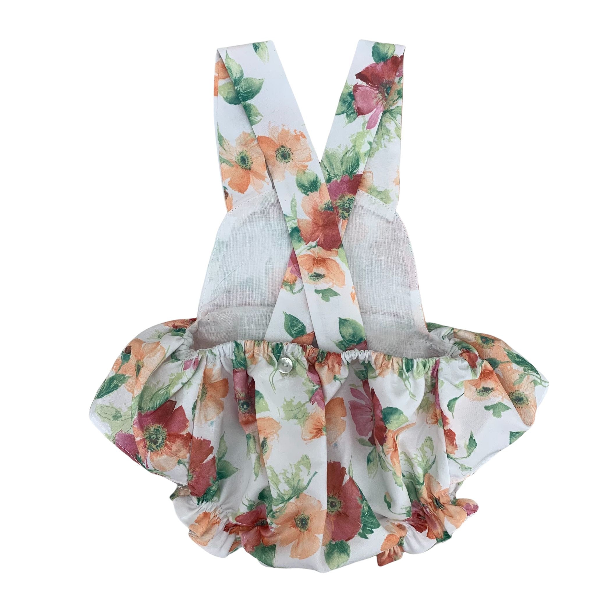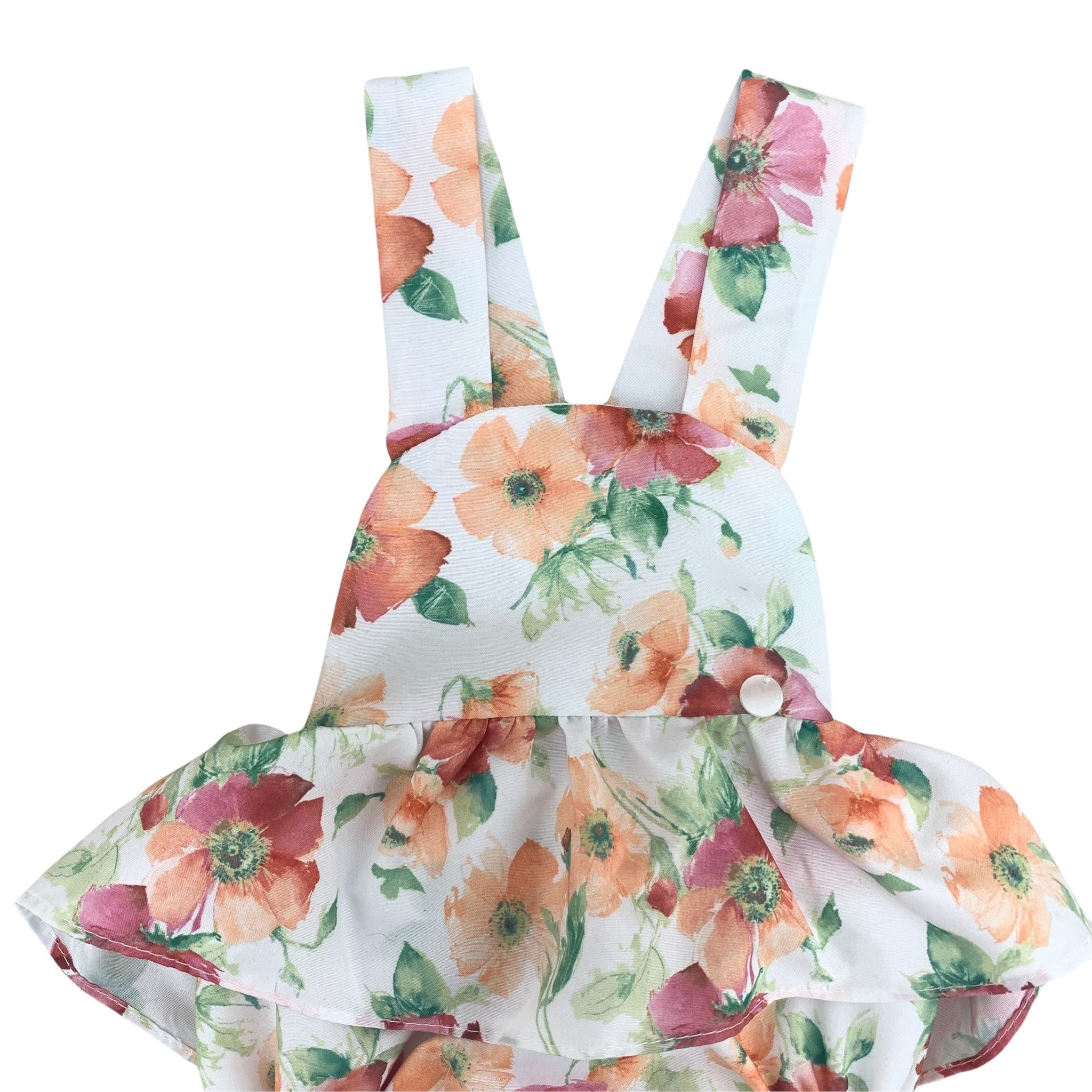 Floral romper with crossover straps at the back, flounce on the hips.
