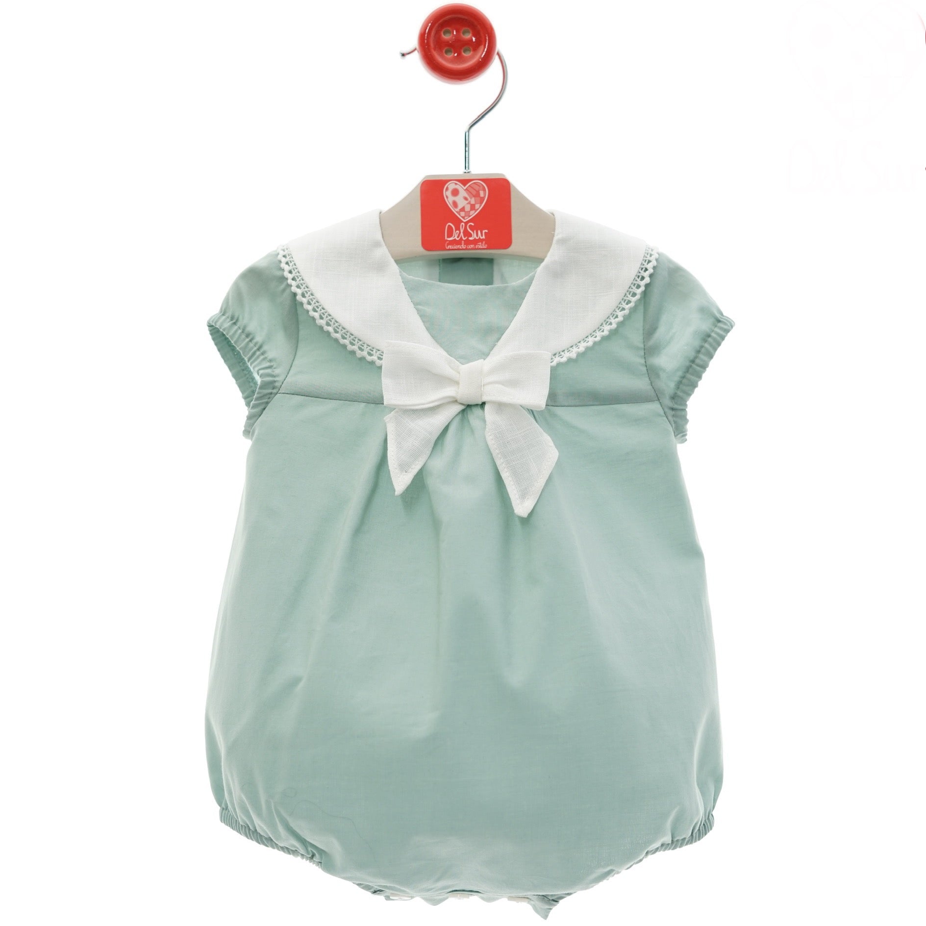 Questo pagliaccetto mezza manica in cotone con collo effetto marinaretta e fiocco è perfetto per ogni occasione: elegante e alla moda per le feste. Realizzato in cotone, è comodo e delicato sulla pelle sensibile del neonato. Aggiungi un tocco di stile al suo guardaroba con questo splendido pagliaccetto del marchio DEL SUR.