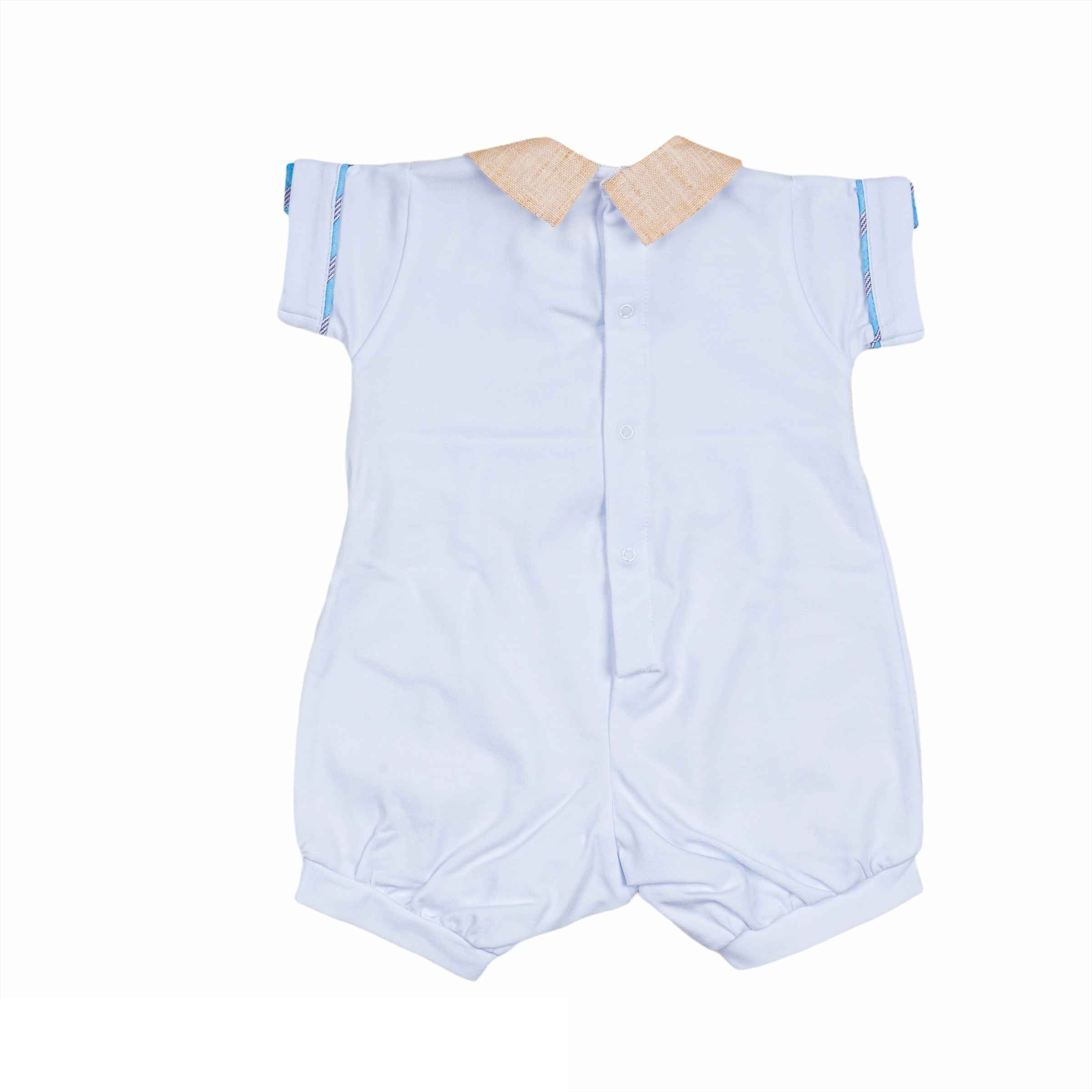 White Cotton Romper With Faux Waistcoat And Beige Linen Blend Collar. Eyelet Pockets, Bow Tie And Edges With Buttons On The Sleeves In Fantasy With The Sky.