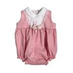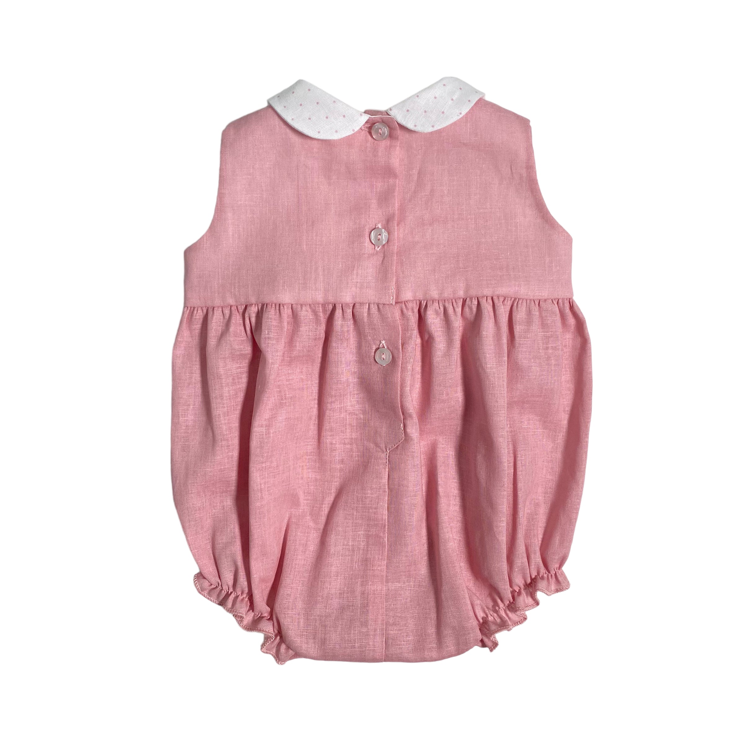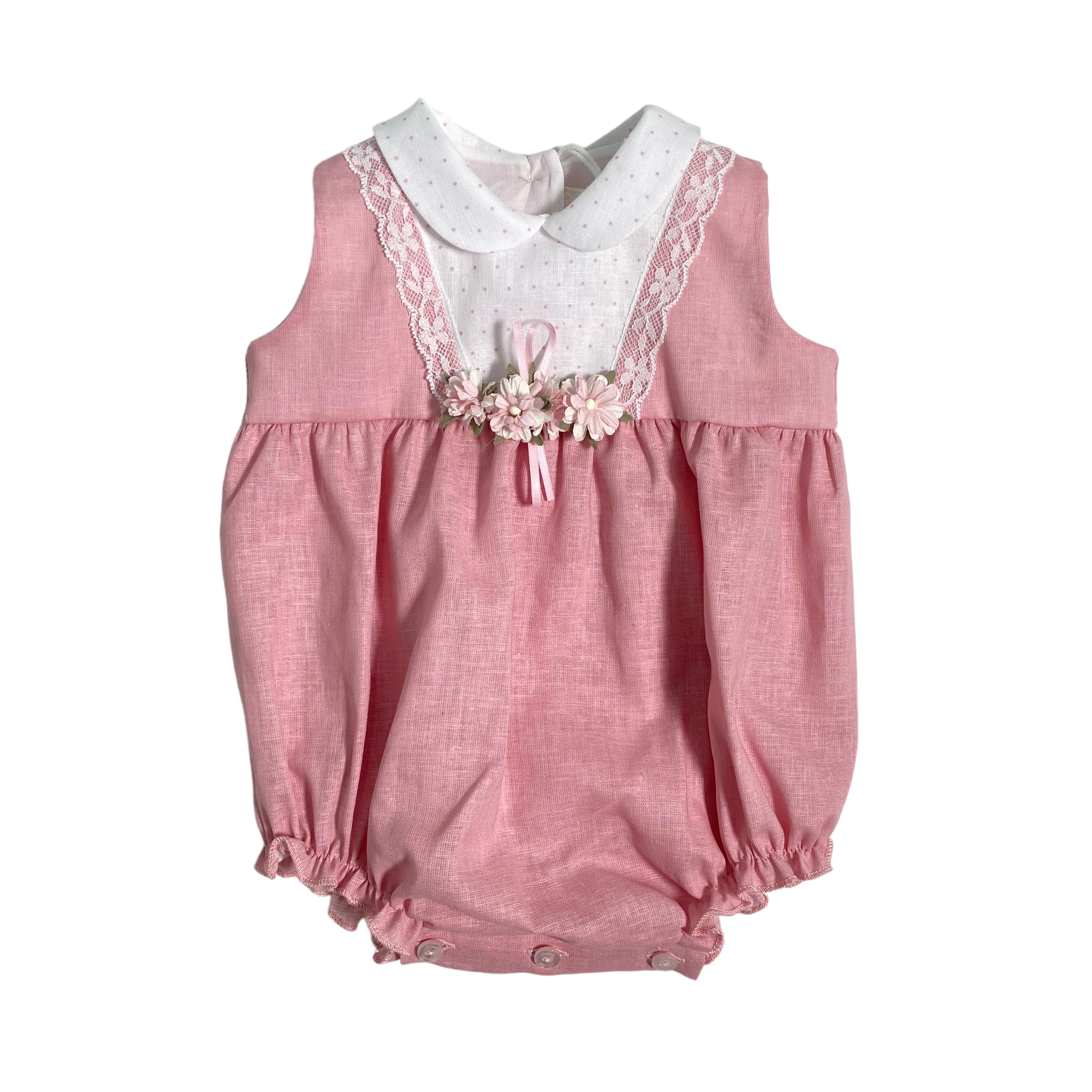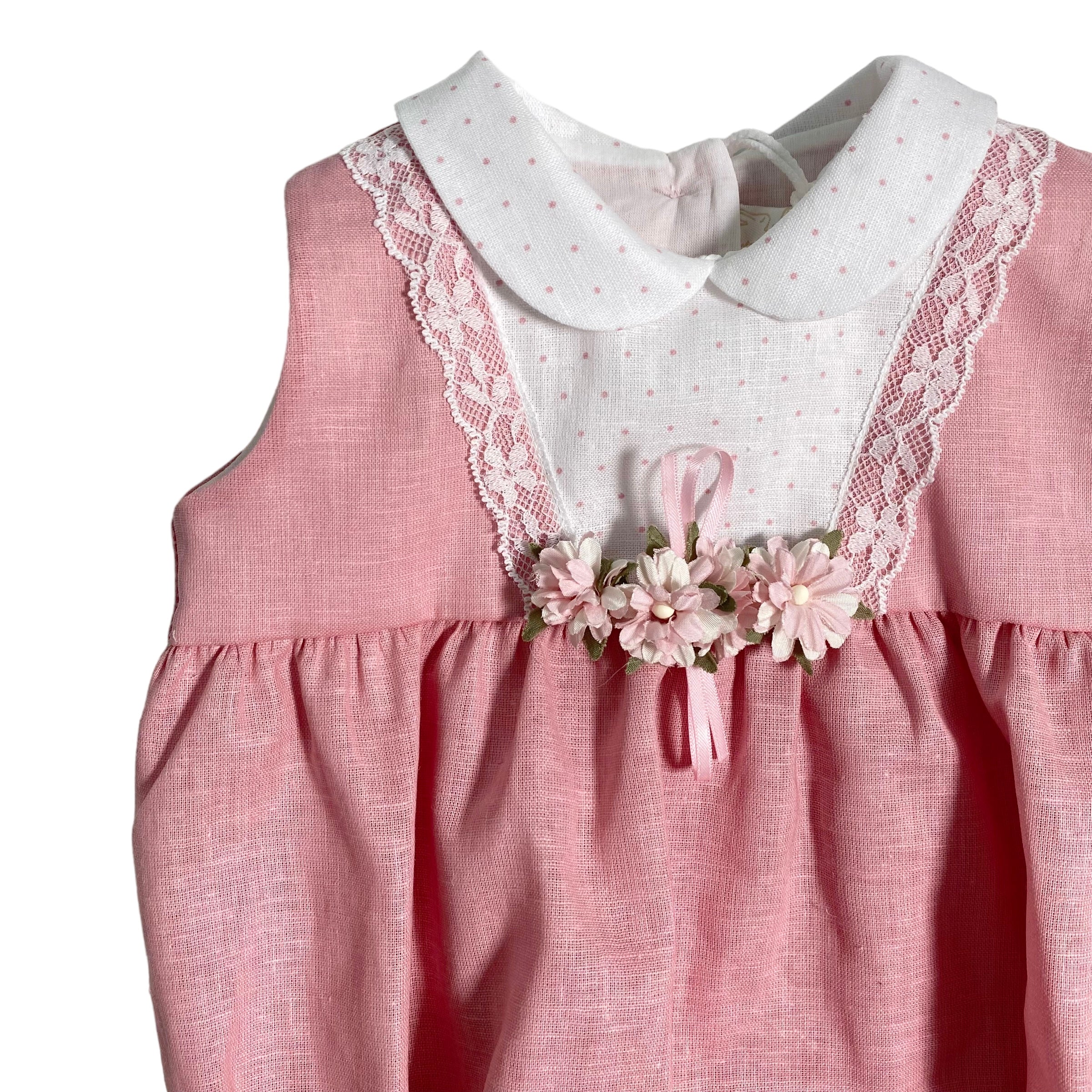 Pagliaccetto in misto lino rosa antico, con applicazioni a poise e fiori.