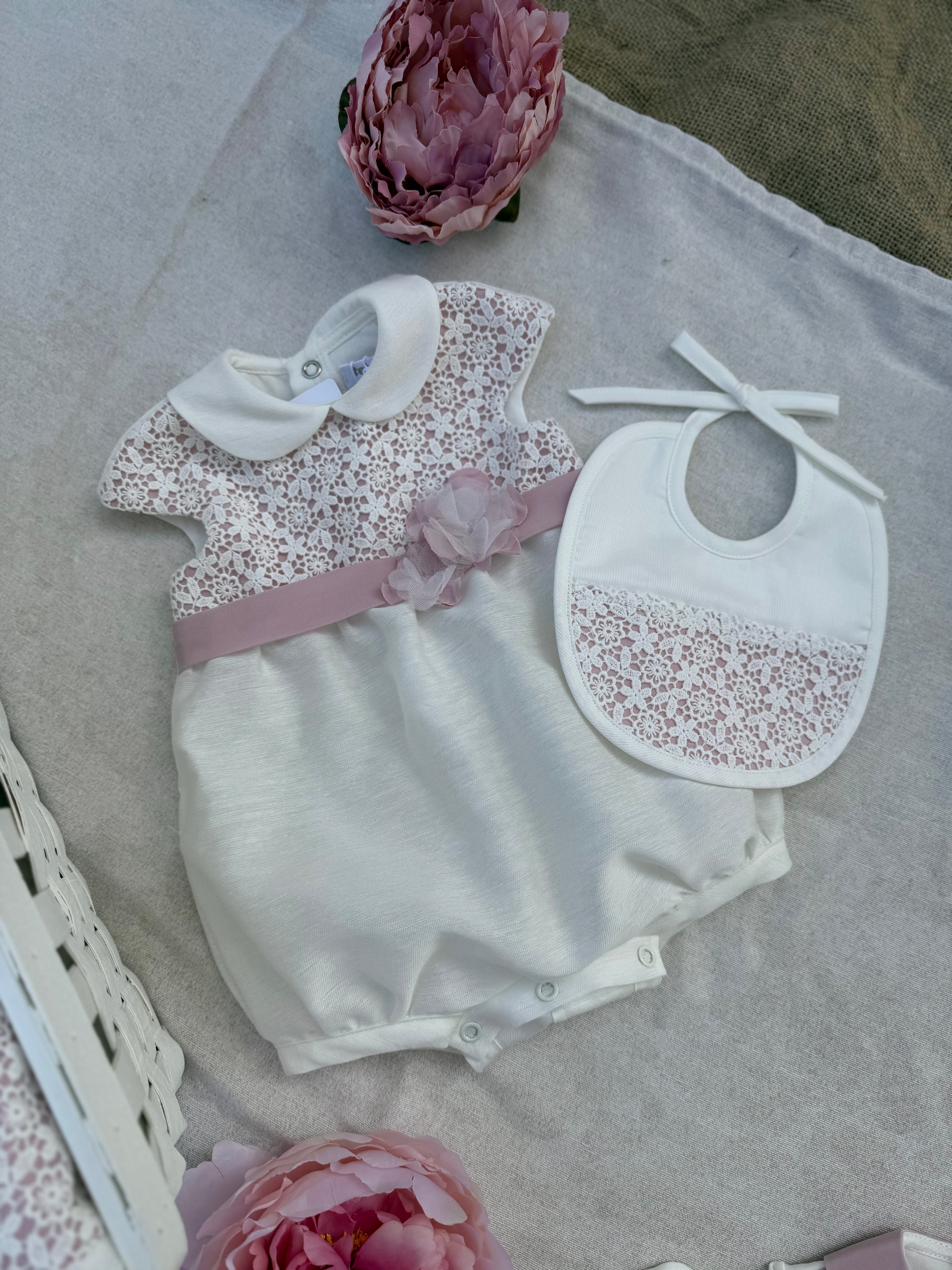 Il nostro pagliaccetto in misto lino è perfetto per la tua neonata. Con il corpetto in pizzo bianco e il fondo rosa antico,  fascia con fiore, sarà un outfit elegante e delicato per la tua piccola. Grazie all'apertura con bottoni a pressione sul retro e sotto, sarà comodo da indossare e cambiare. Ideale anche per la clinica corredino.