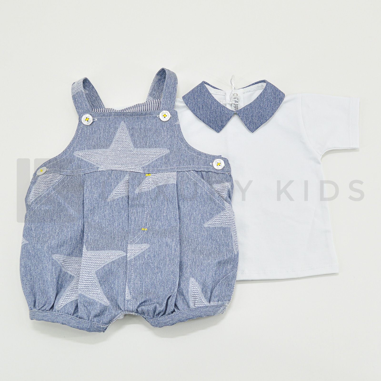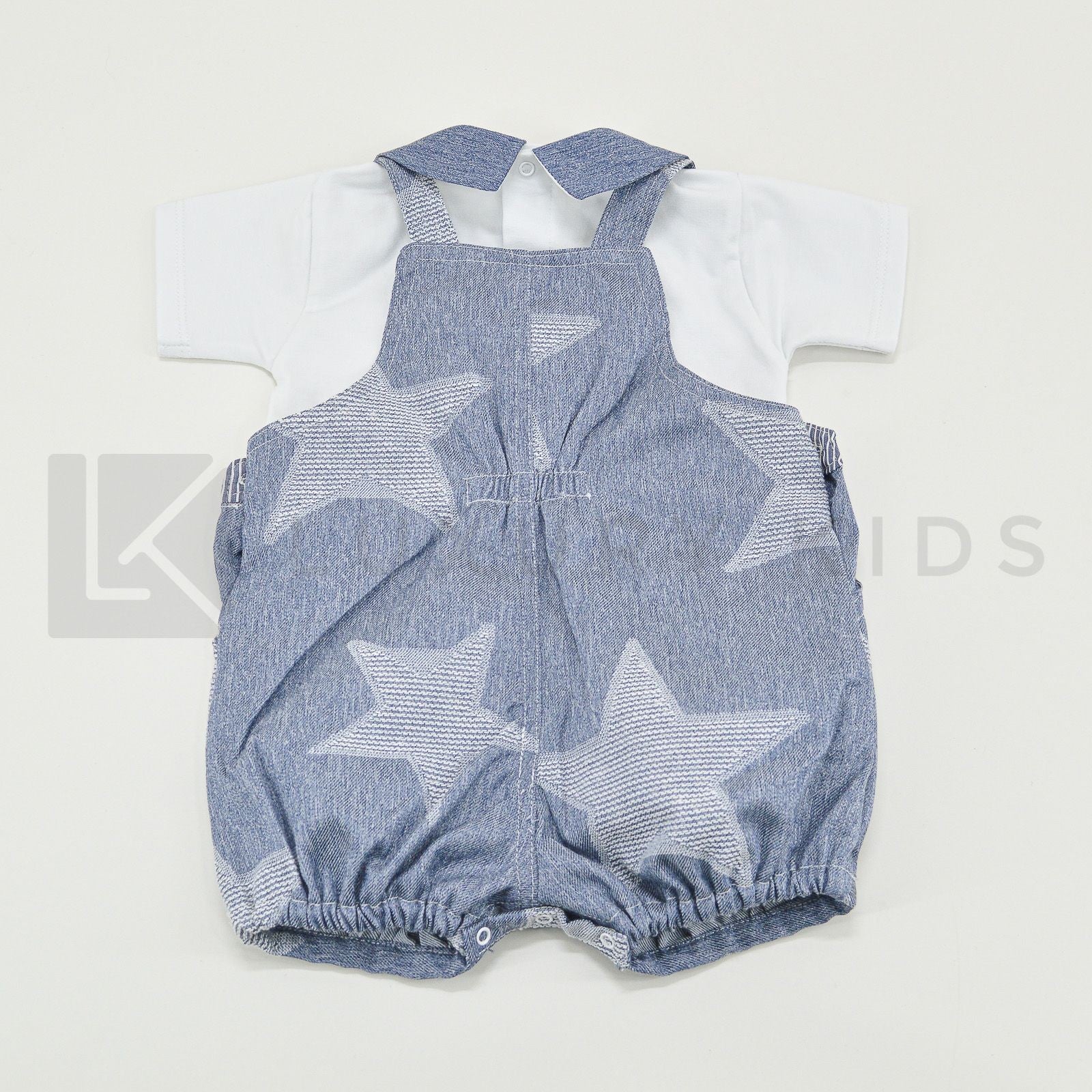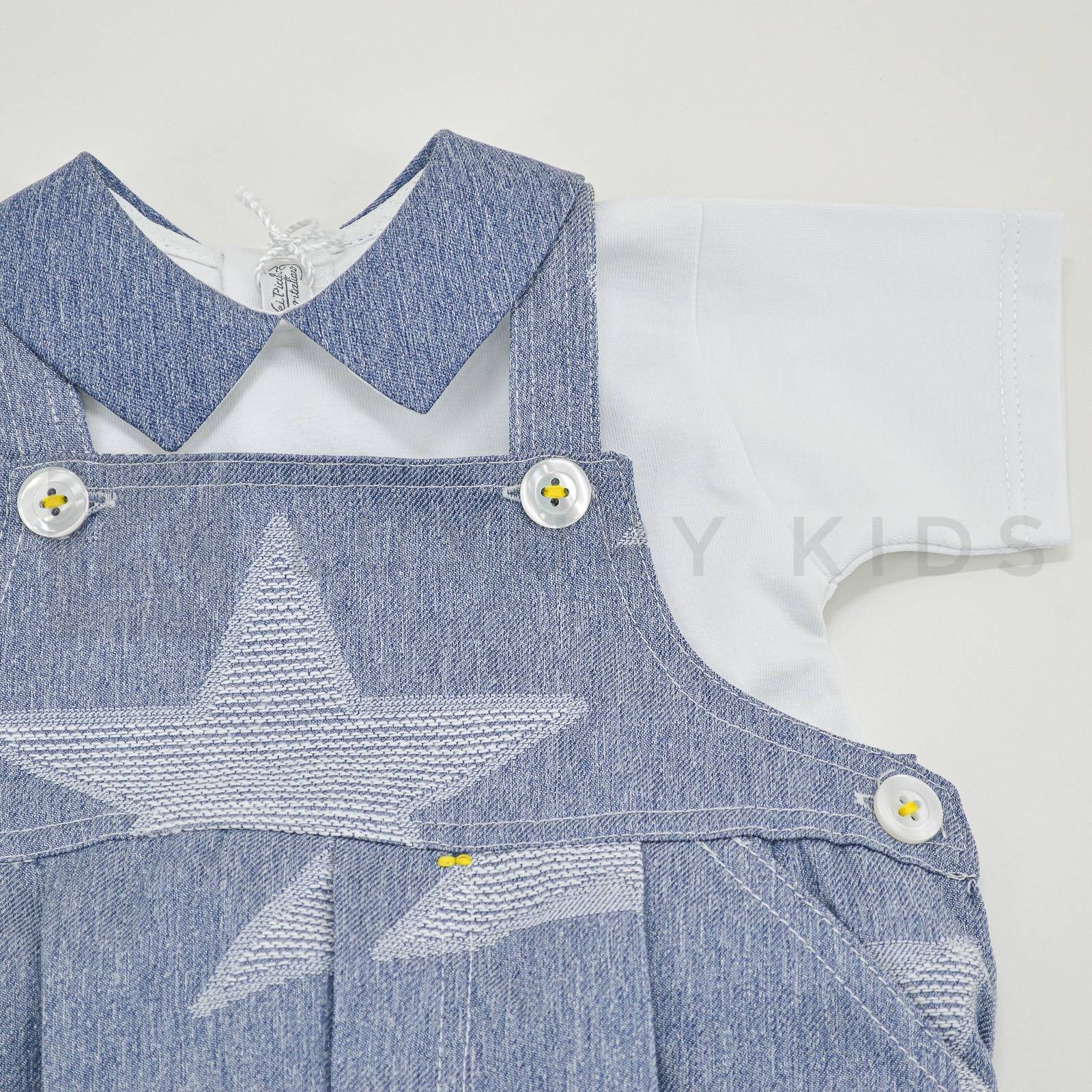 One-piece romper with white t-shirt and denim overalls.