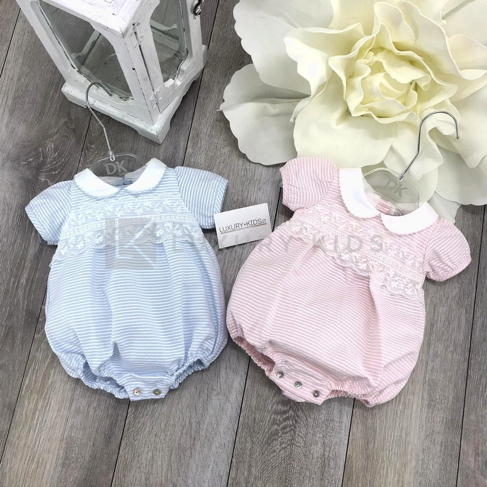 Striped cotton half sleeve romper, with white collar and lace appliqué on the front.