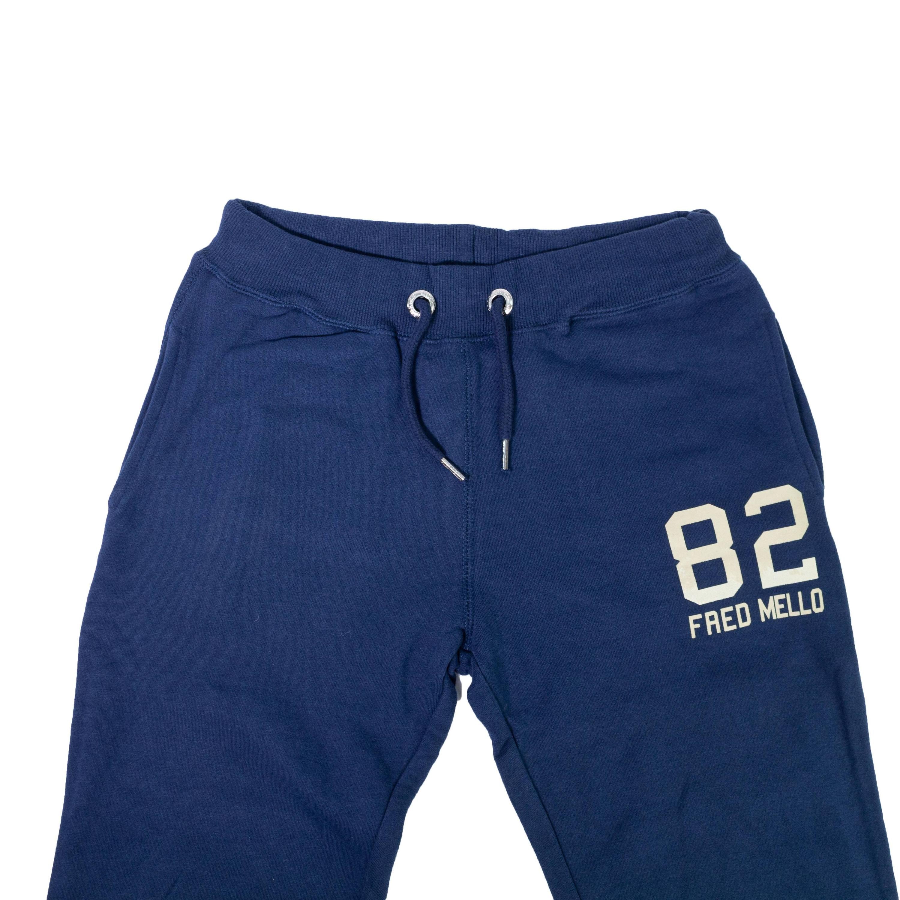 -Solid blue sweat suit trousers with america pockets and beige print on the front