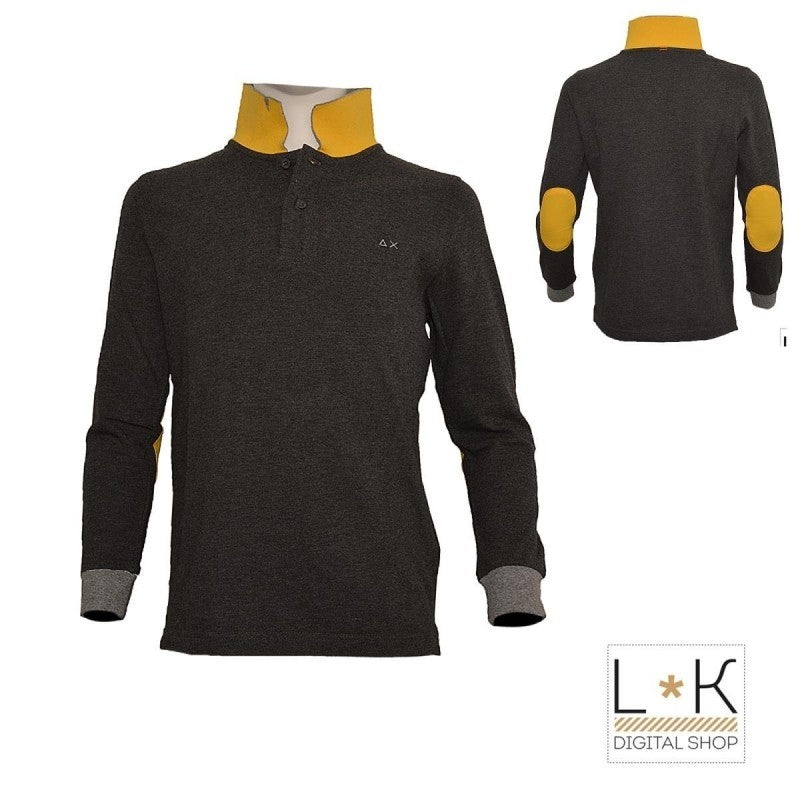 Solid color gray long-sleeved warm cotton polo shirt with mustard-colored patches and collar