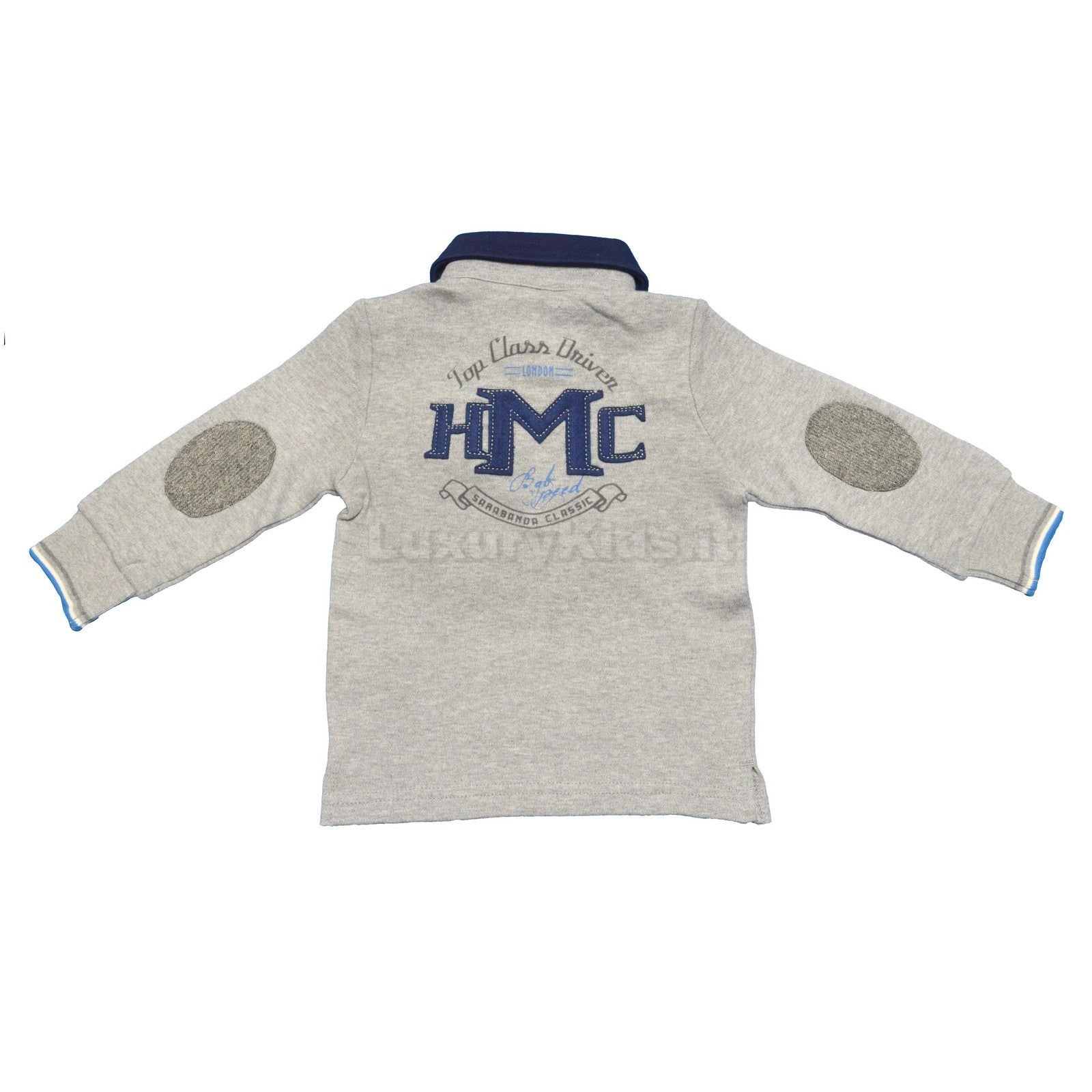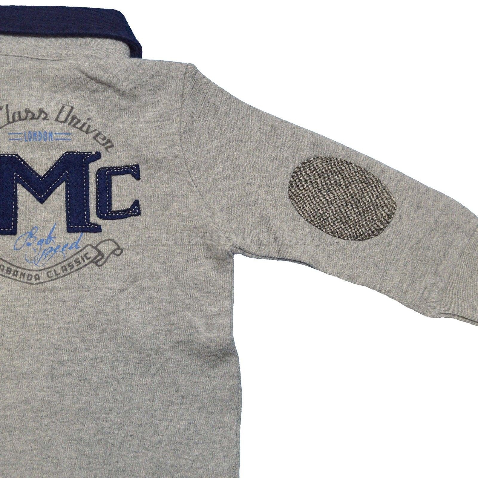 Warm gray cotton polo shirt with blue collar, embroidery on the chest and patches on the elbows