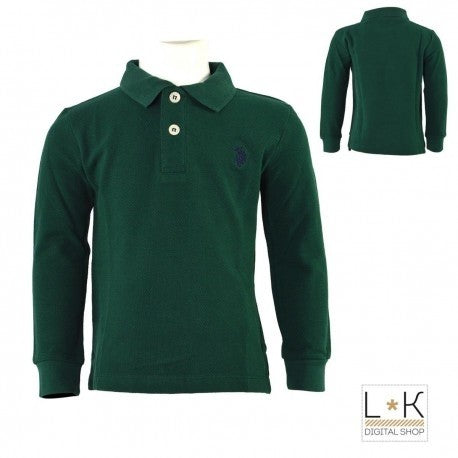 Warm green cotton polo shirt in solid color with long sleeves and button closure