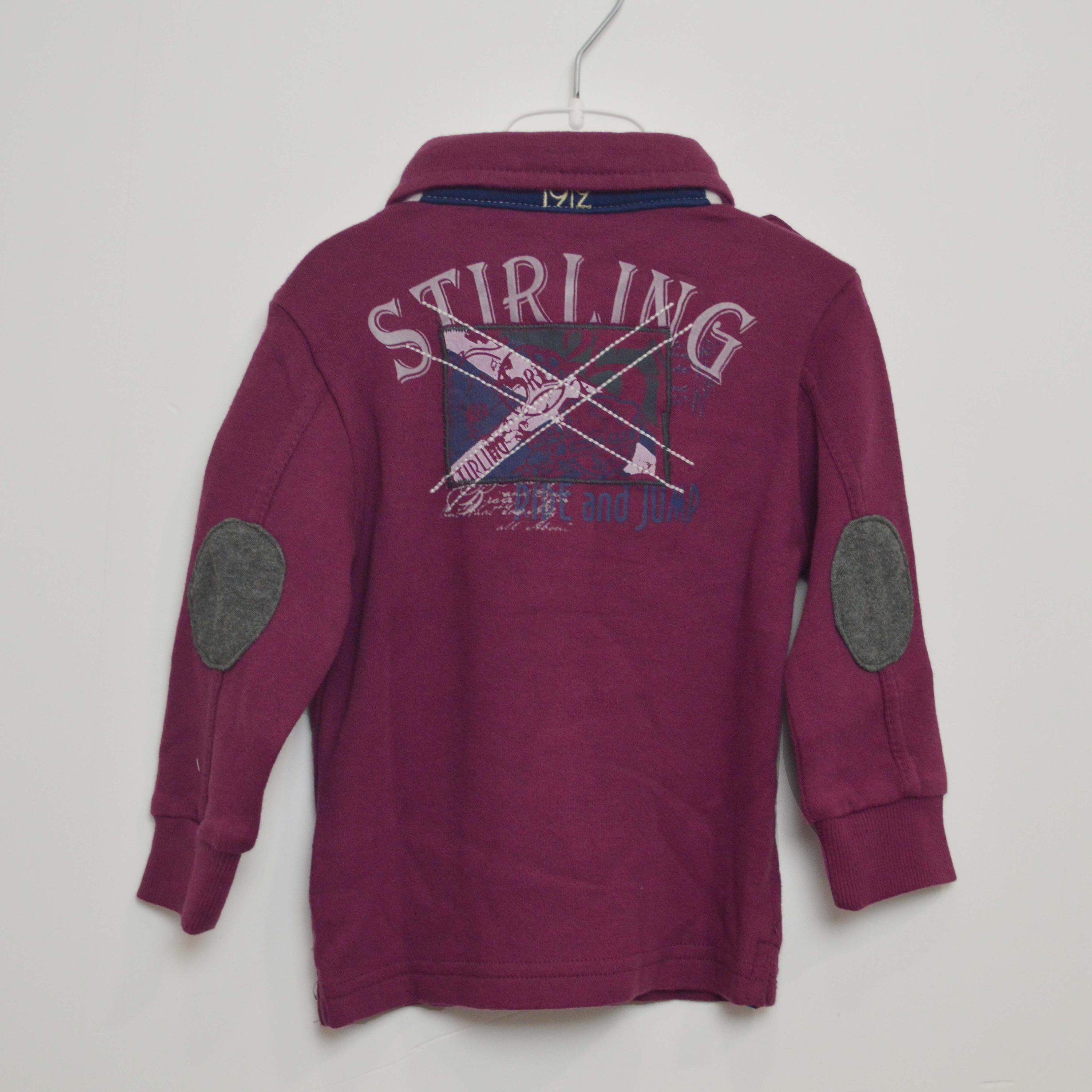 Warm purple cotton polo shirt with chest pockets and print and embroidery on the back with elbow patches