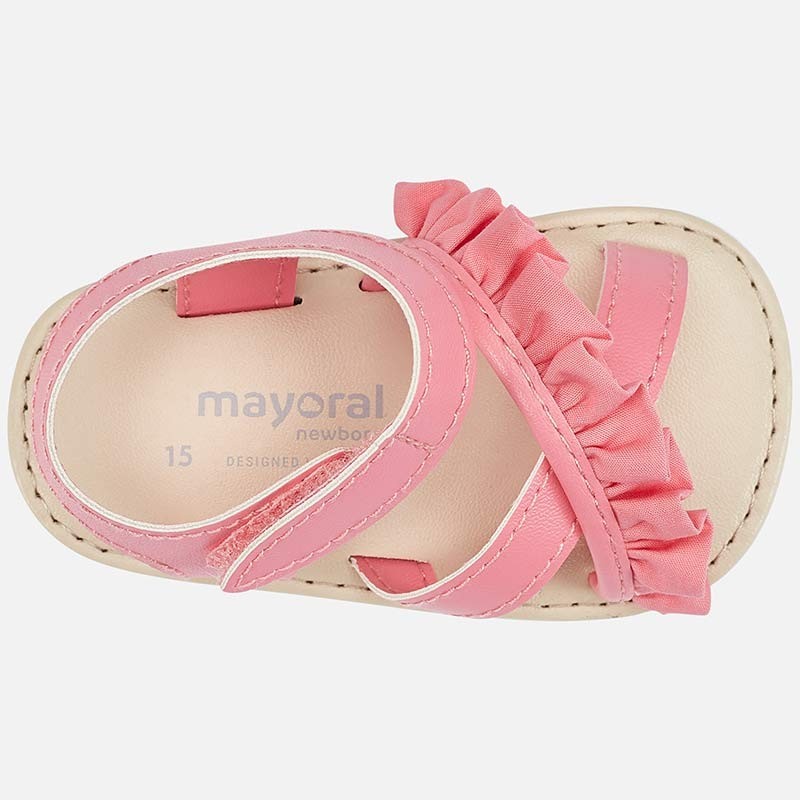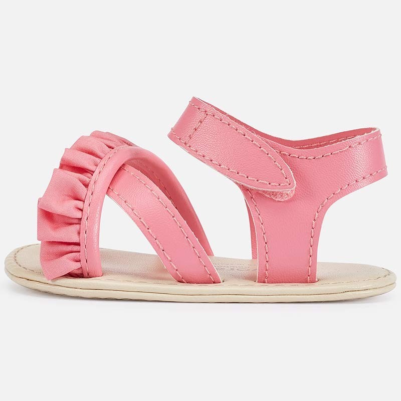 Summer sandals for baby girl ideal for hot summer days. Adjustable velcro closure that guarantees a better grip of the foot. Decorative elements: decorative ruffle. This item is shipped in a Newborn line, ideal as a gift.