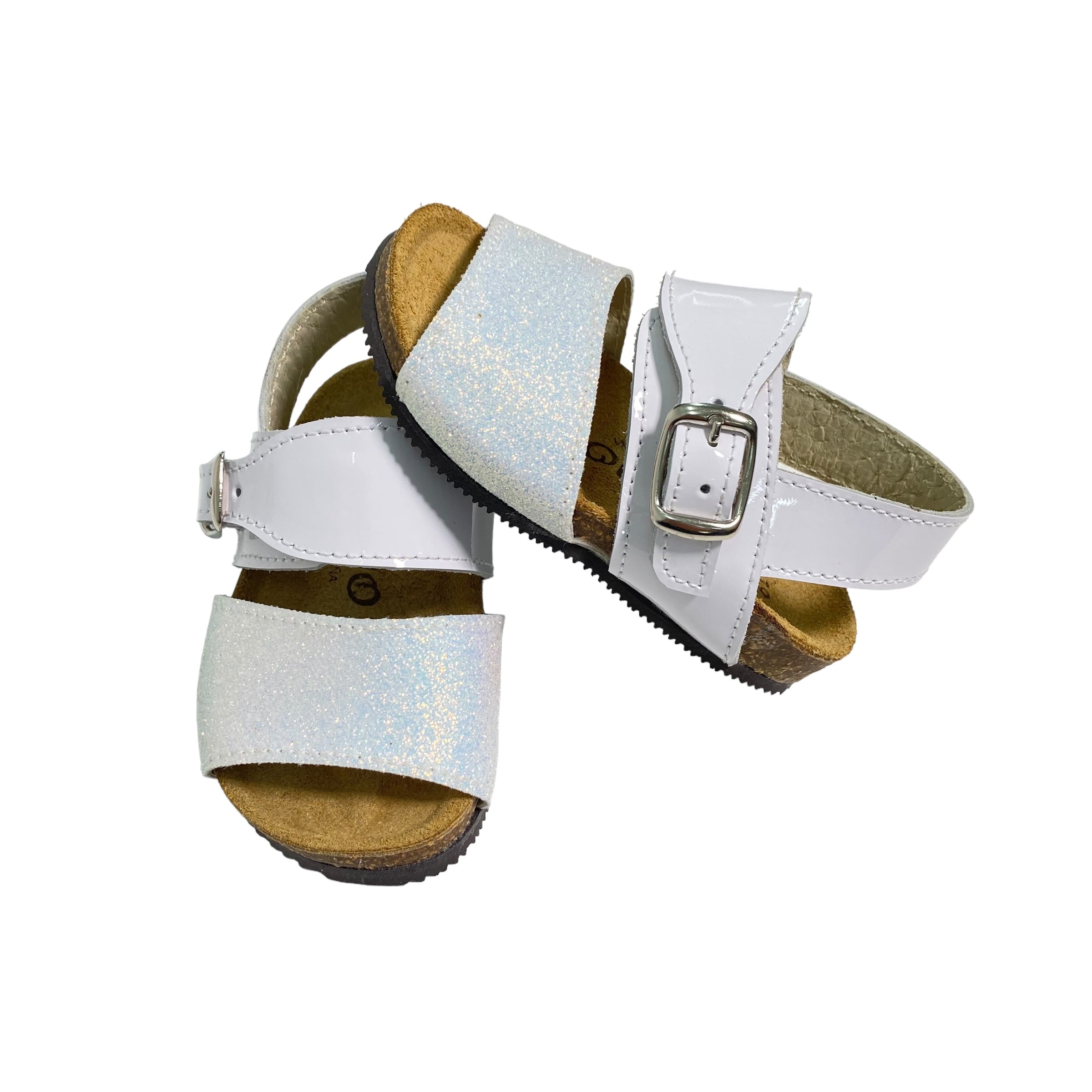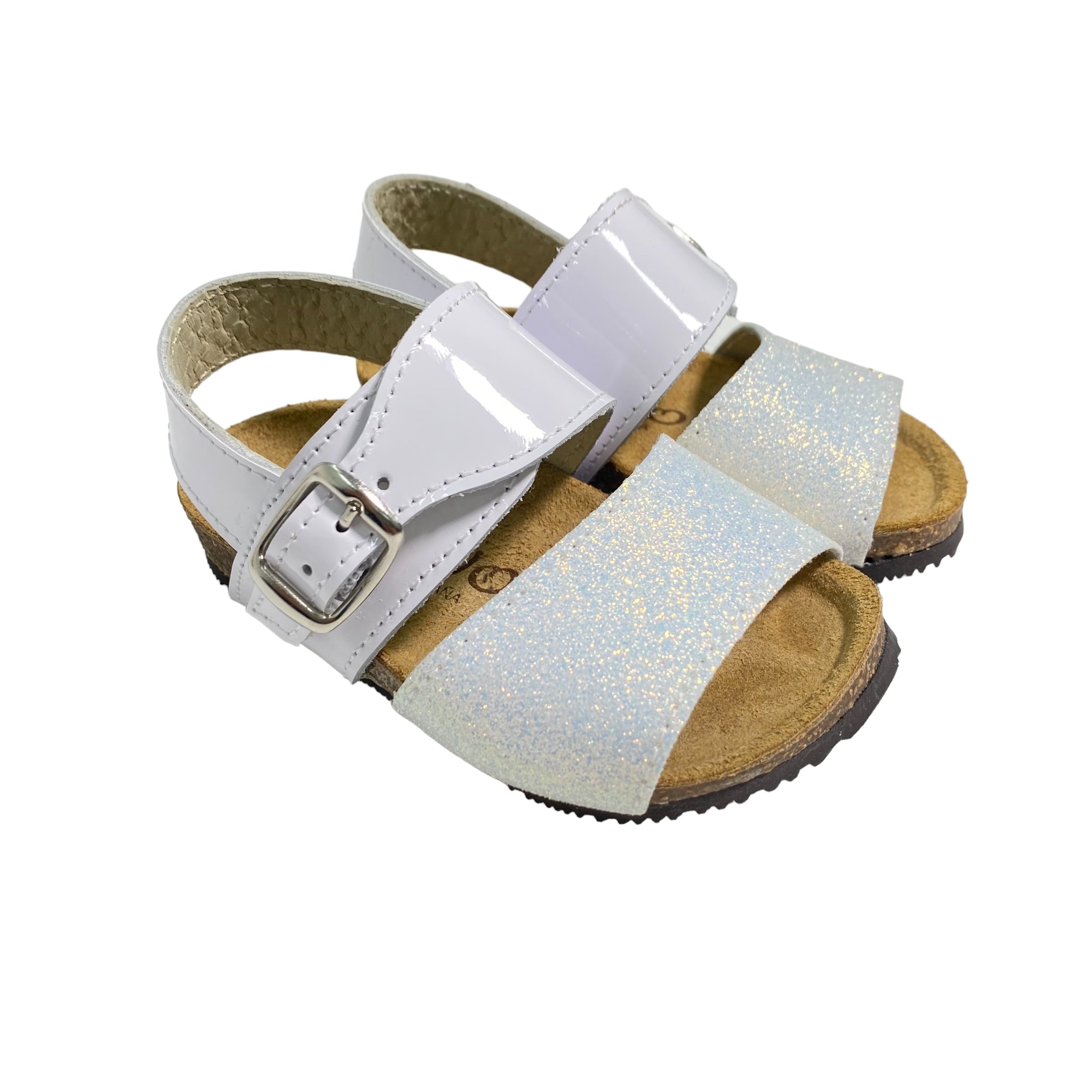 Sandali primi passi in pelle, con fibie regolabili e suola in gomma.