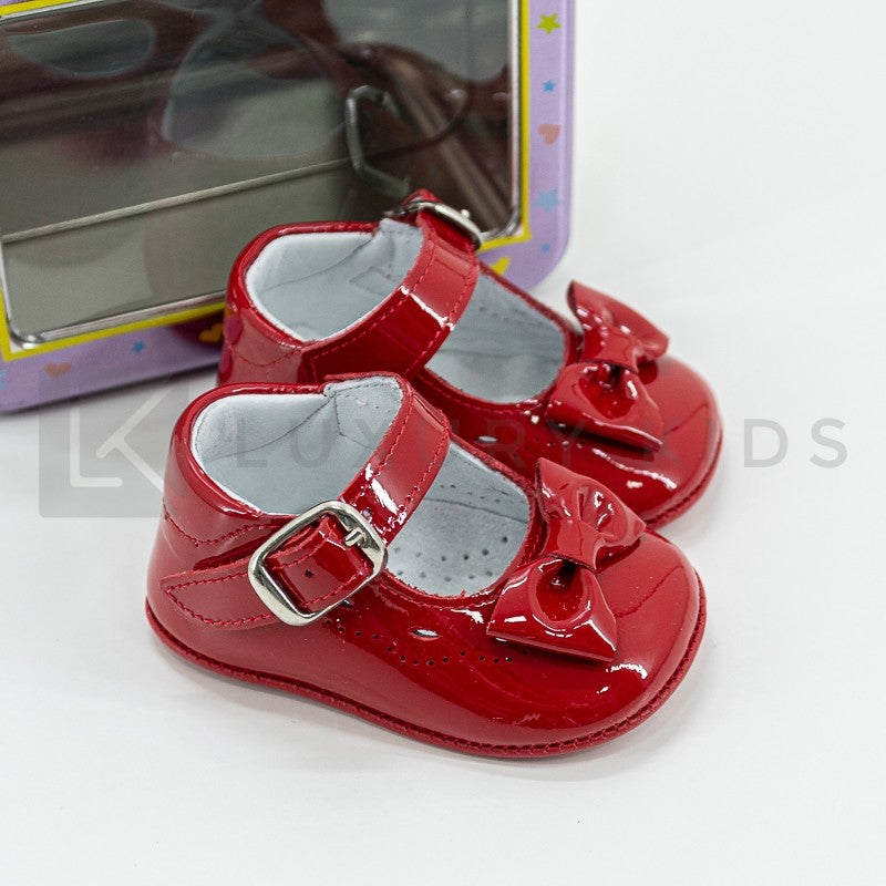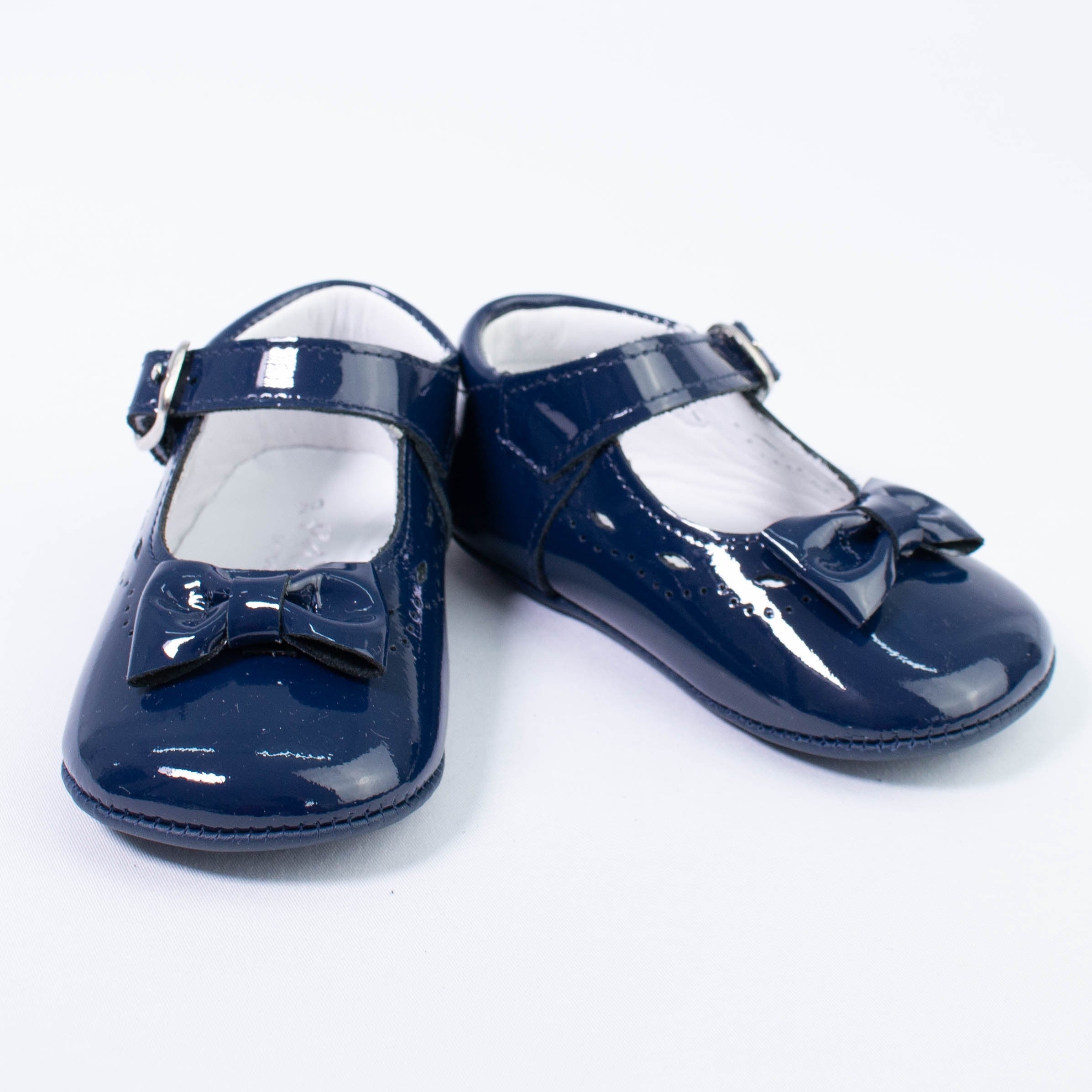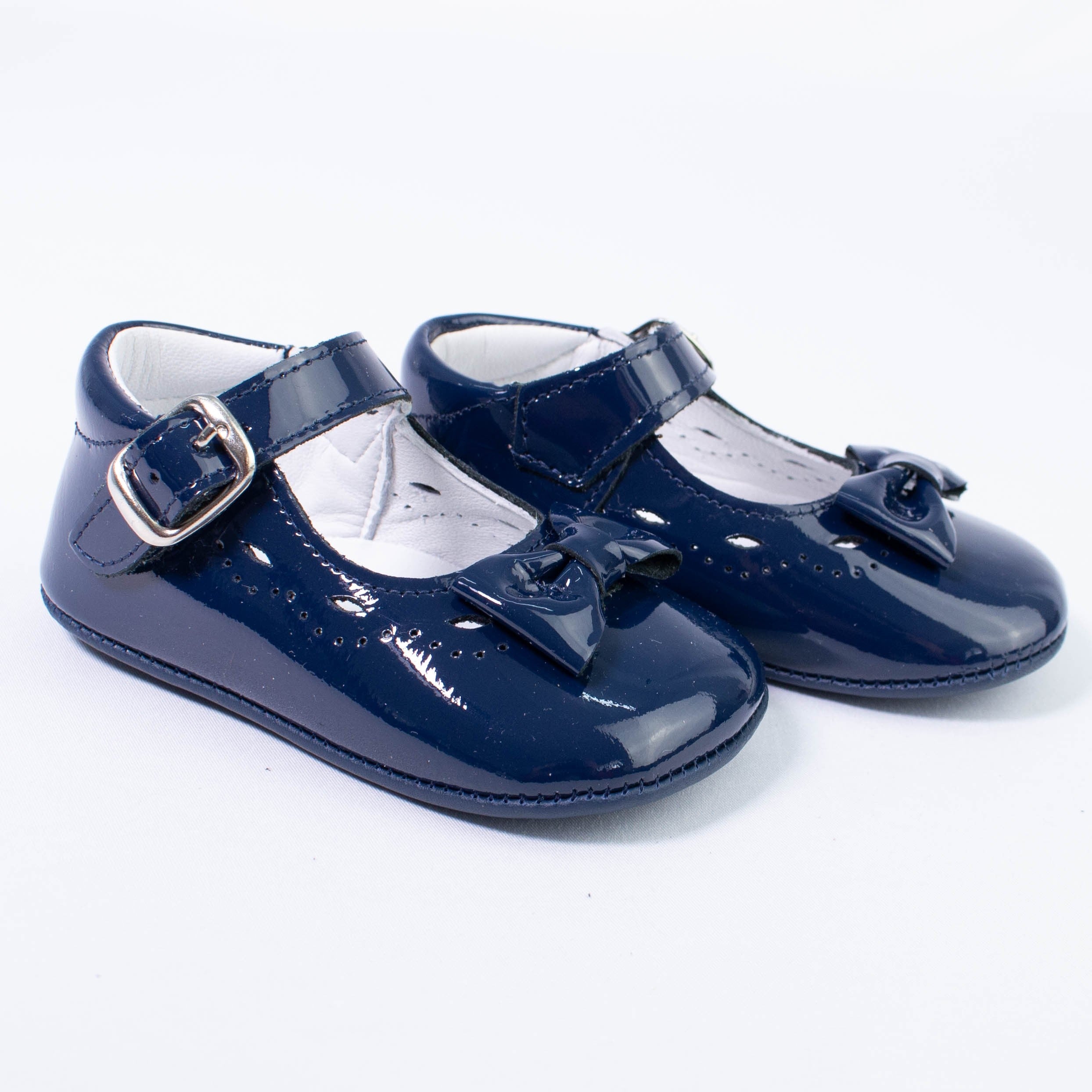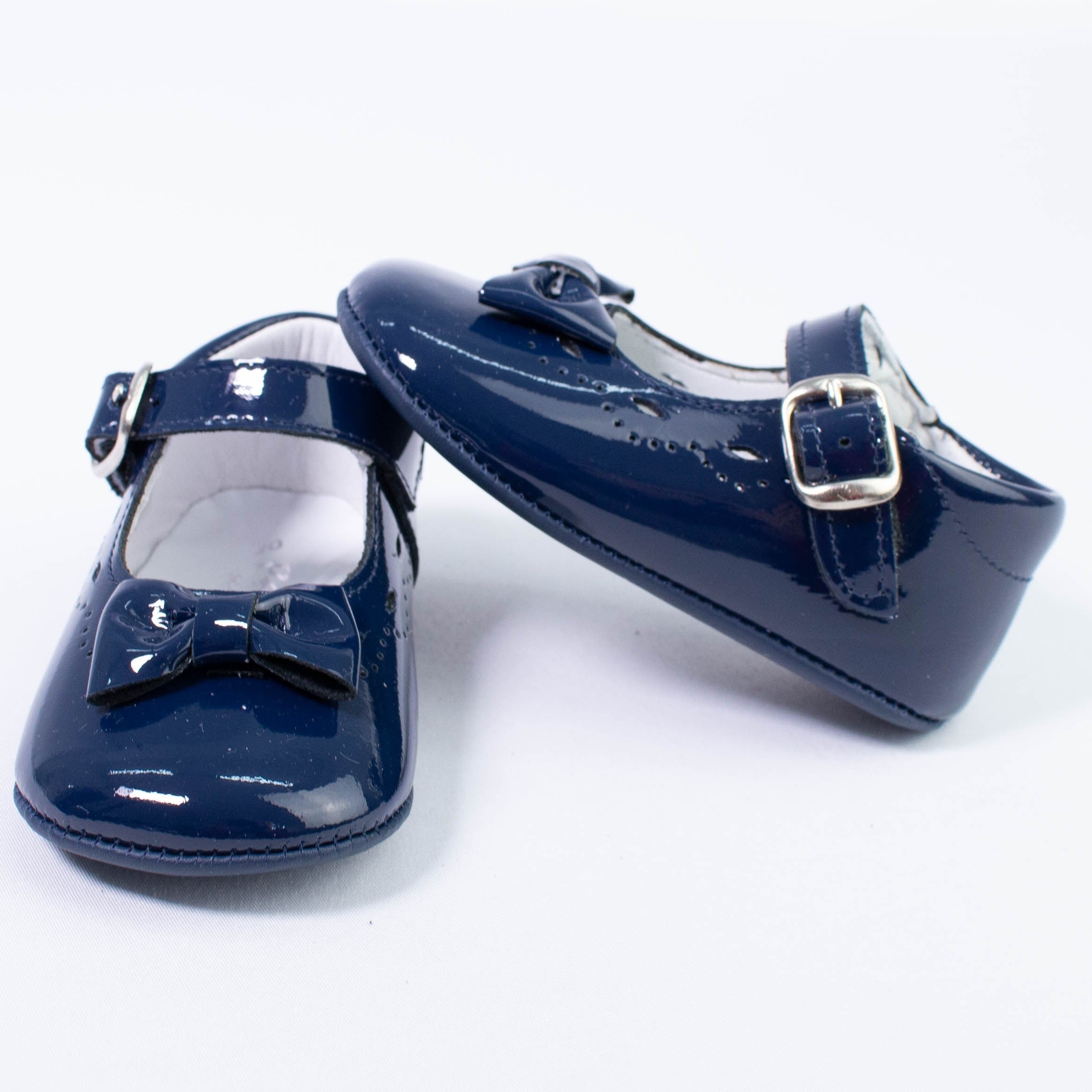Patent leather cradle shoe with bow on the front and buckle closure.