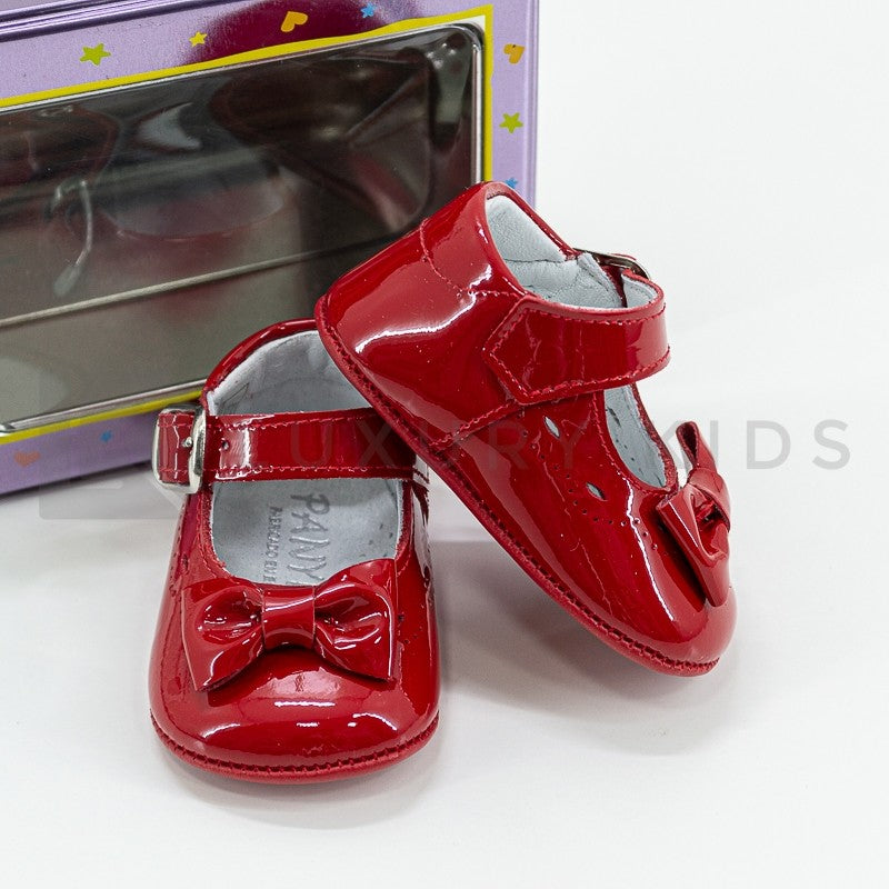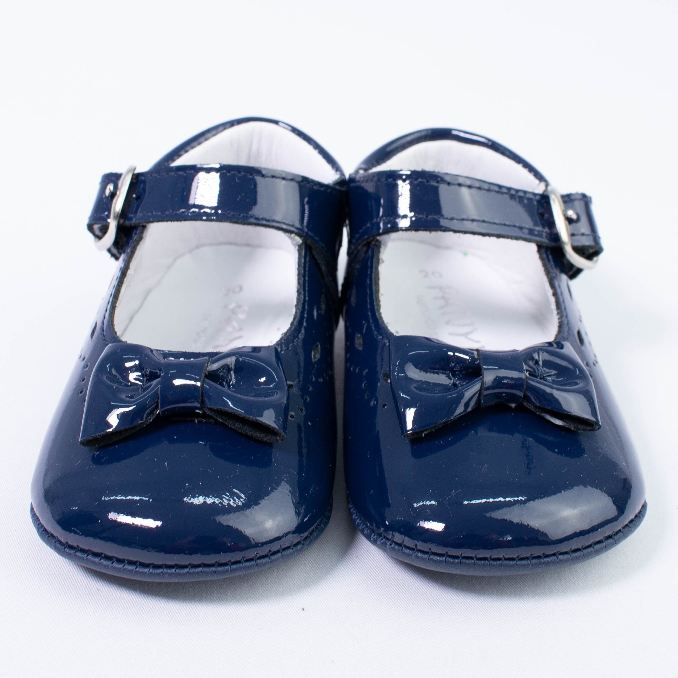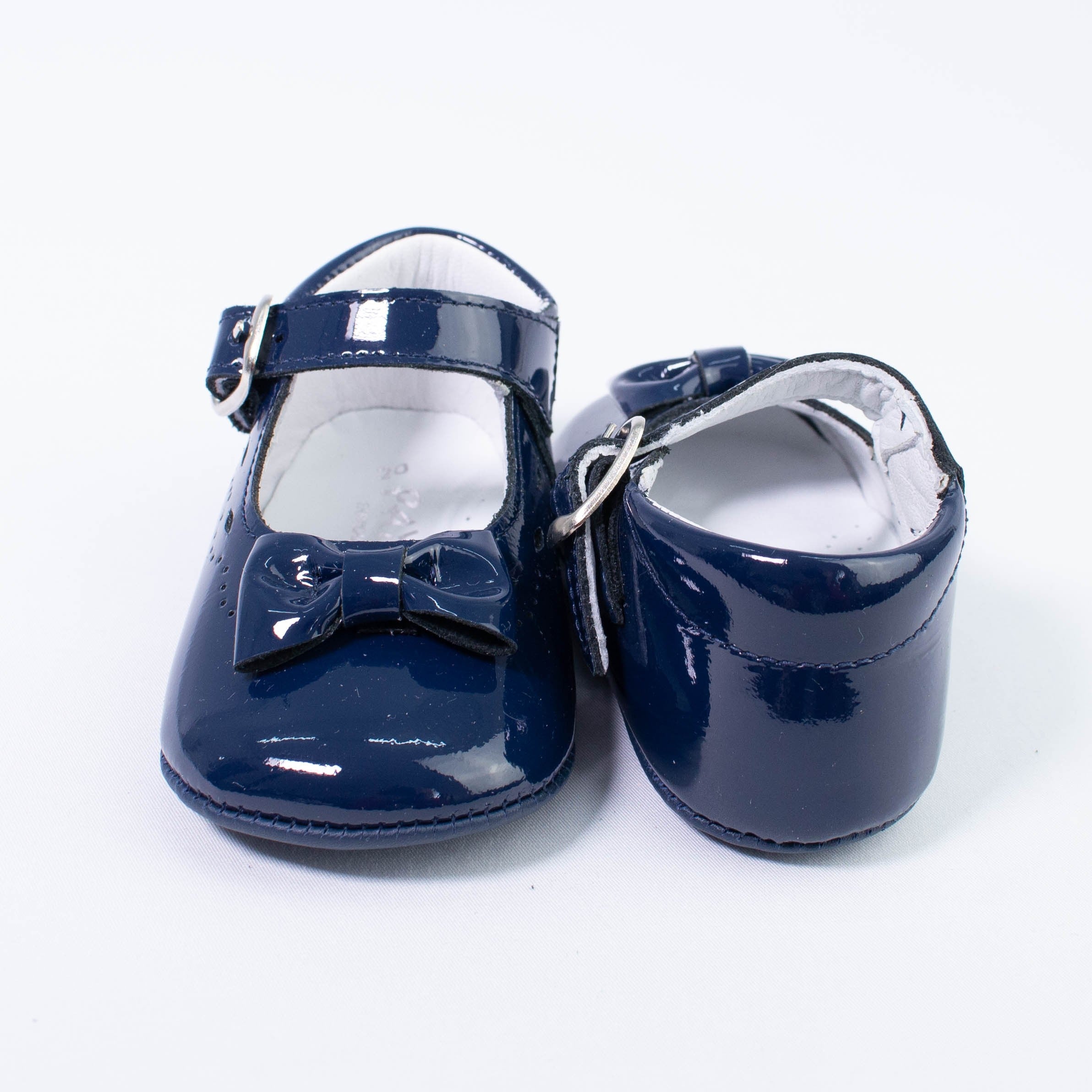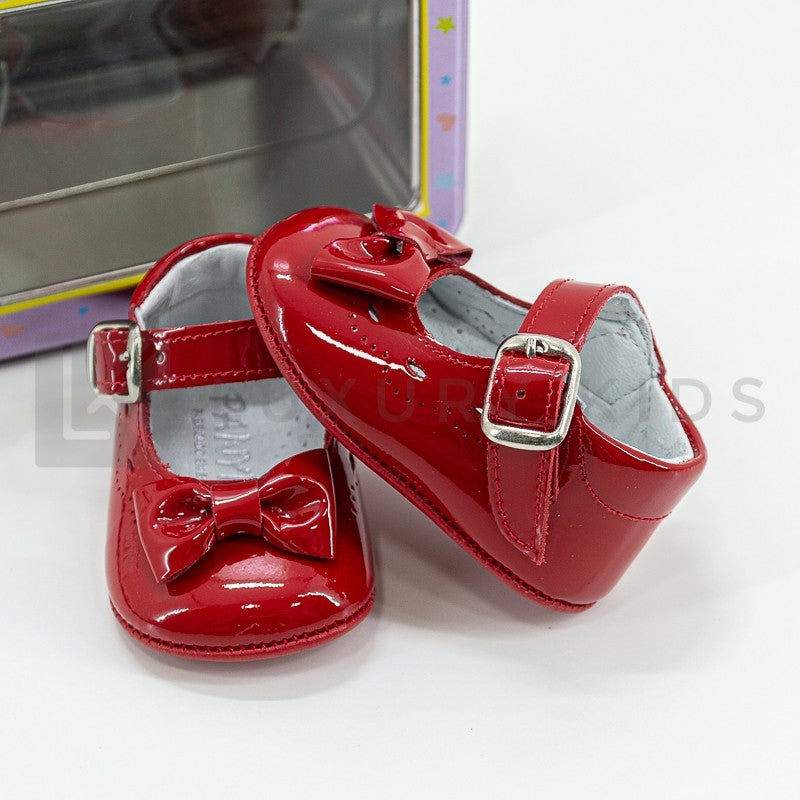 Patent leather cradle shoe with bow on the front and buckle closure.