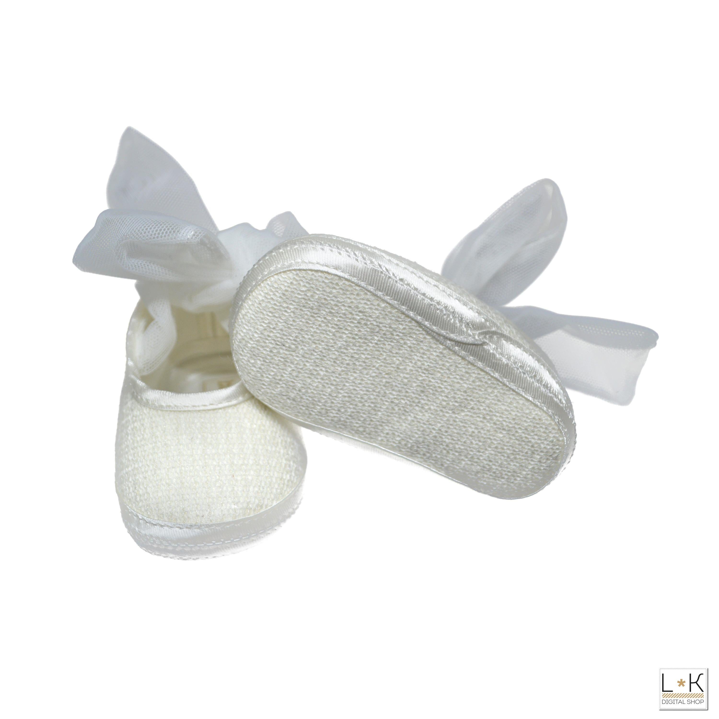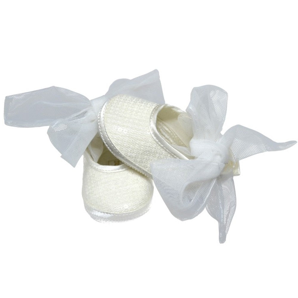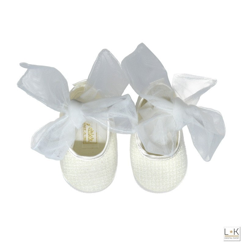 Ballerina in fabric covered with sequins and tulle bow on the instep