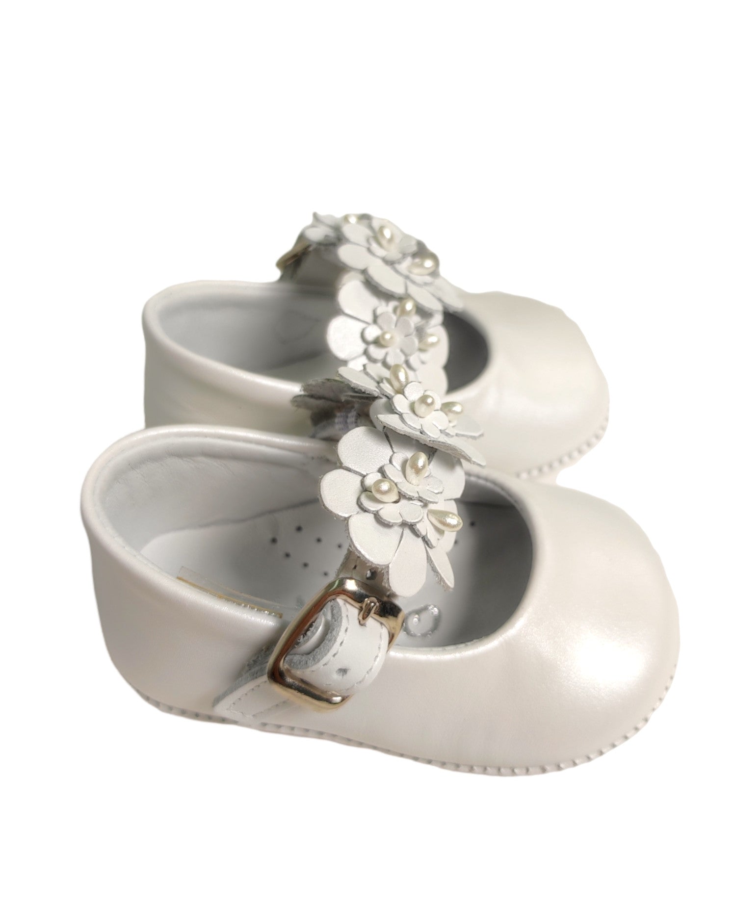 Ballerina cradle shoes, in white leather, with strap closure.