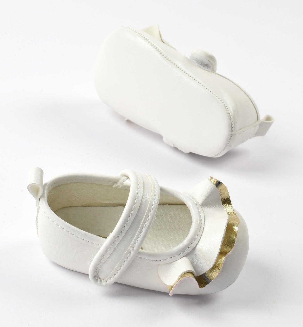 Minibanda baby girl shoes in faux leather. Ballerina model with velcro closure, double ruffles on the front and with touches of gold, which make them perfect to wear for baptism or for a special occasion